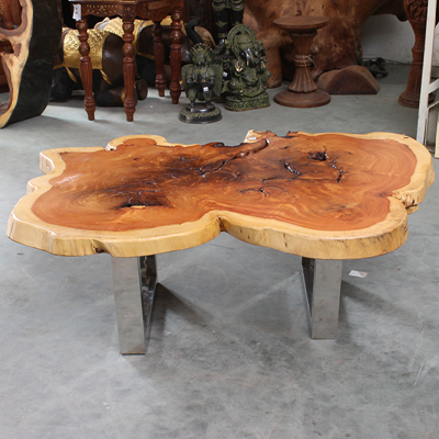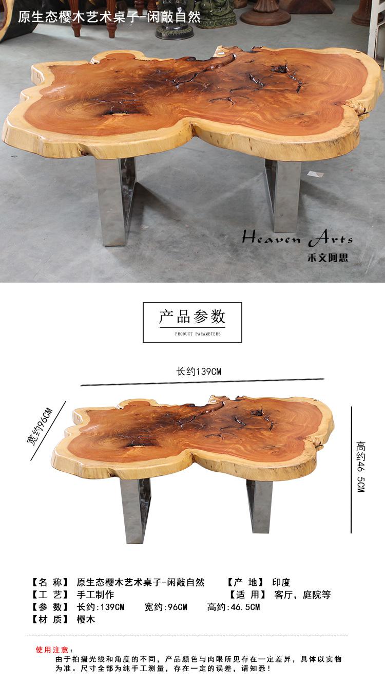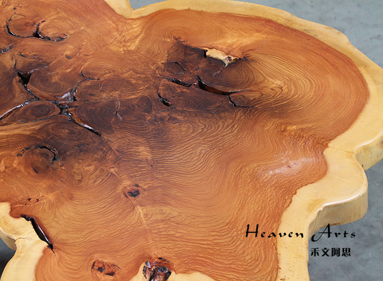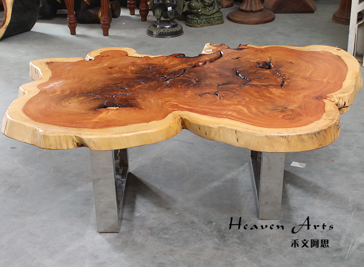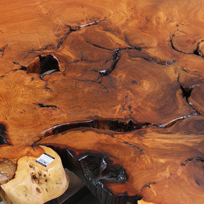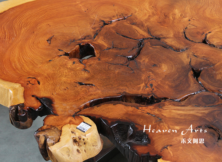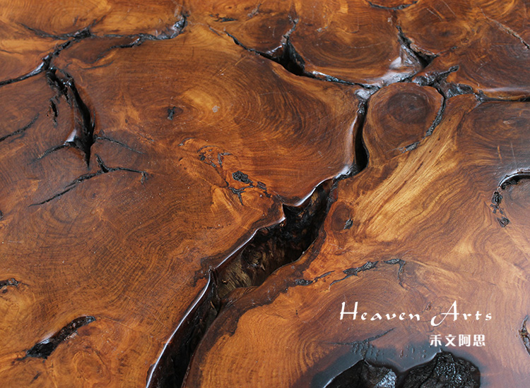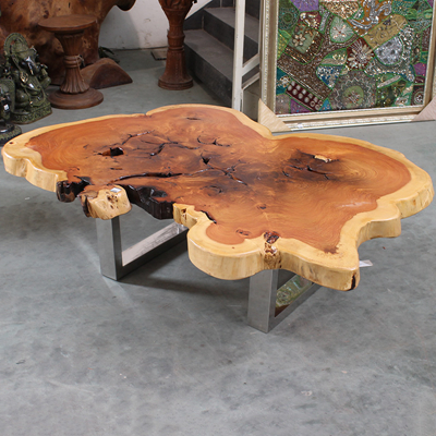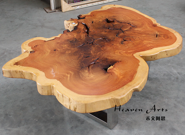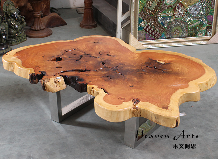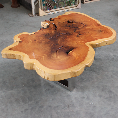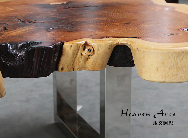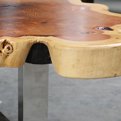 此款来自印度的原生态瘿木桌子,有着不拘一格的自然独特造型,置于家中能自成一道风景。平整的桌面上纹理在清晰可见,一圈一圈描绘出自然雅韵。桌上两个天然凹陷的空心洞,是桌子独一无二的烙印亦是原生态的闪光点。蜿蜒的边缘有着极为雅致的弧度,与自然相比一端被斩断的痕迹尤为明显,却有耐人寻味的雅韵。搭配方方正正的铁艺桌腿设计,使时尚融于自然,尽显典雅气质。