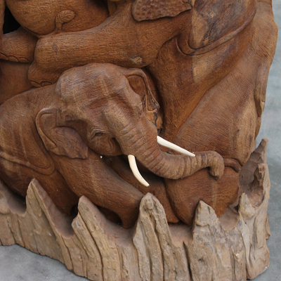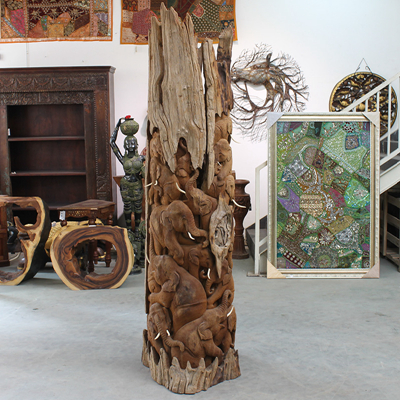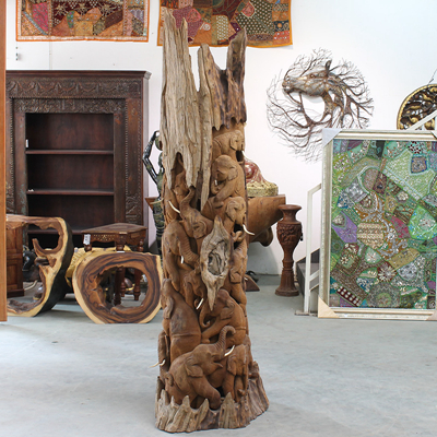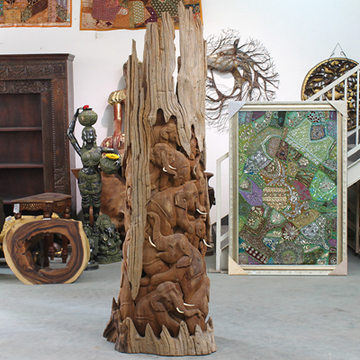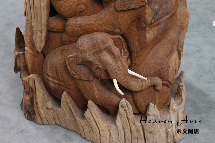 印度技艺高超的雕刻大师,在老柚木上精心雕刻姿态各异的大象,给人艺术的享受与美好祝福。两米多的摆件上,体态各异的大象重重叠叠,精湛的雕刻使每一只都惟妙惟肖。表情愉悦的大象或低首或昂头,有的鼻子自然下垂,有的高高卷起,有着抬起前肢,有的屈着后腿,细腻的雕琢使它们格外可爱讨喜。在每只大象细节处理上都是极尽精细,象背上勾勒简约的装饰,甚至是连大象的皮肤纹路都清晰可见,可见雕刻大师超高技艺。