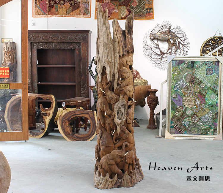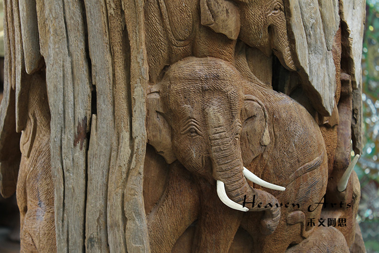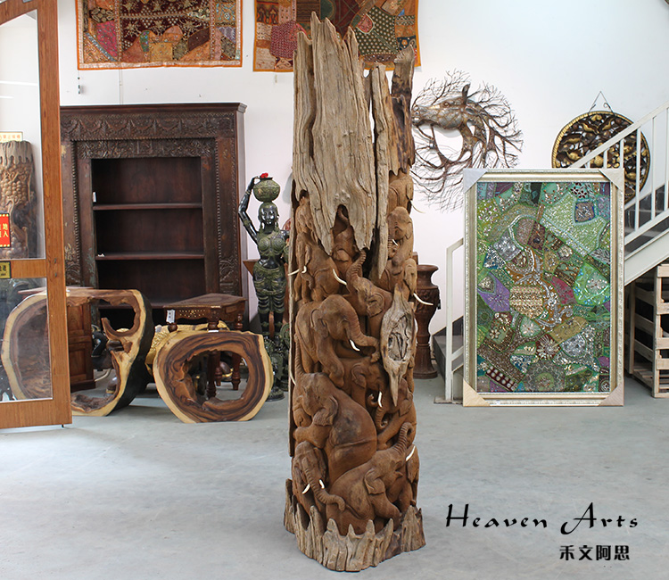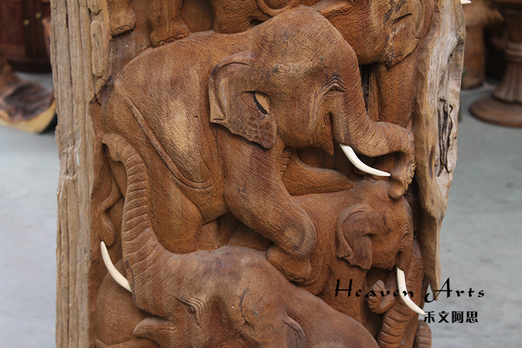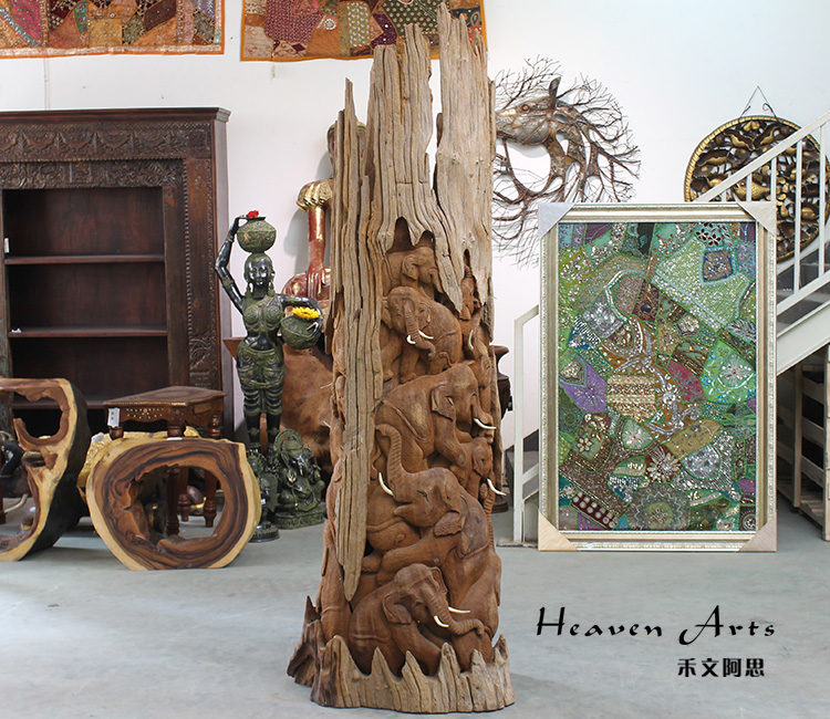 柚木被称为“万木之王”拥有特殊的木性,在很久以前,就因独特的木性和美观的外表被欧洲皇室贵族用来制作奢侈家具。而老柚木那股历经风霜的醇厚感,散发岁月沉淀的韵味更叫人爱不忍释。在古代,大象就是斋普尔皇亲国戚威权和礼仪的象征。大象的鼻子可吸水象征可把外面的财吸进来。走动的“象”寓意走向成功,带有如意的象称为“吉祥如意”。
