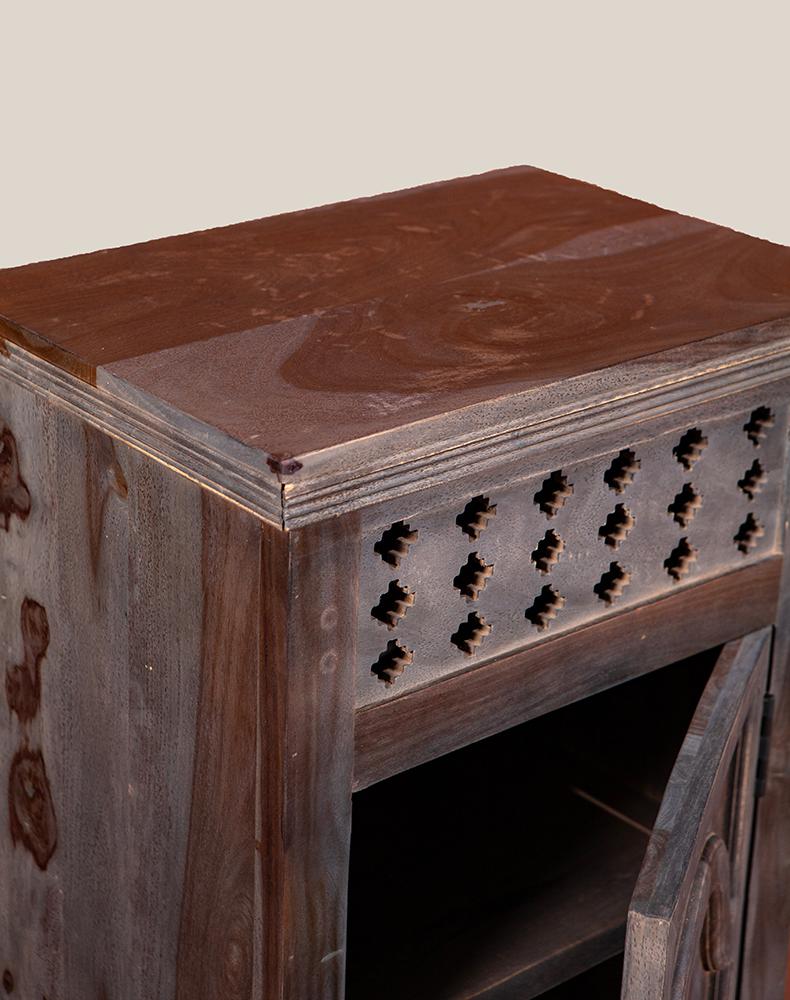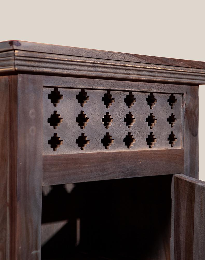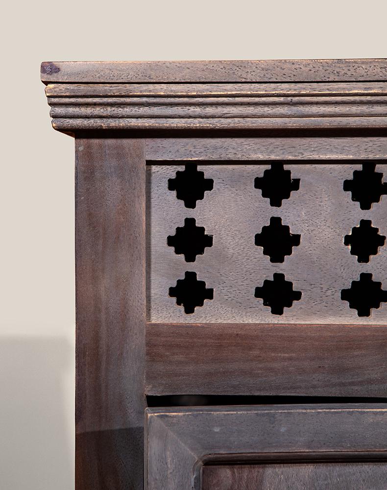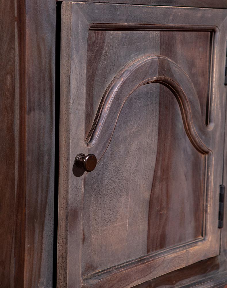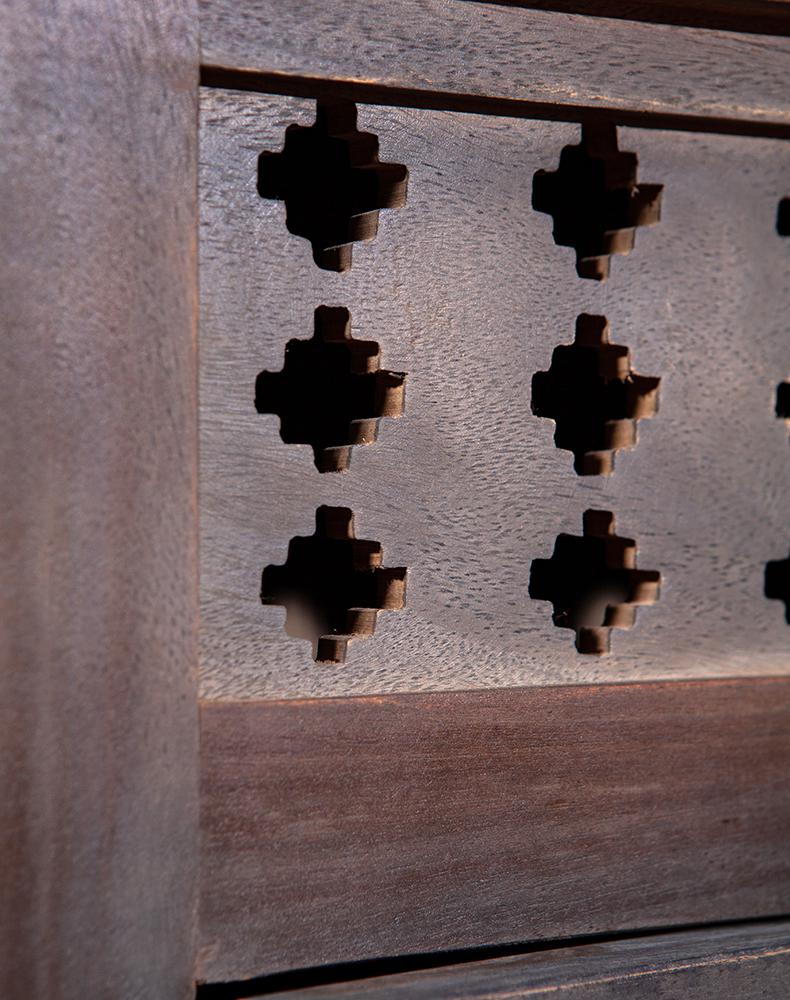 此款复古风老柚木柜子以粗犷的手法对柜子进行上色做旧处理,使其拥有富贵高雅的气质而不显矫揉造作。不似现代家具一般光洁亮丽,柜面上木纹与摩擦痕迹渲染出独特的风味,这正是老柚木岁月沧桑的最佳诠释。具有传统风味的老柚木柜子,柜门上的雅致设计为其增添时尚感,上沿镂空雕刻的图案不甚精细,却透出一股质朴古拙的迷人气息。此款老柚木柜子用简约而不失雅致的设计,传递出独特的文化气息,使复古变得平易近人。