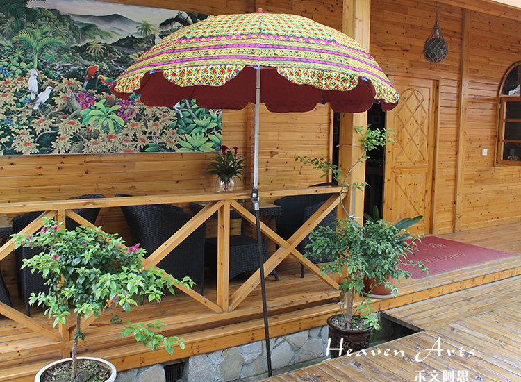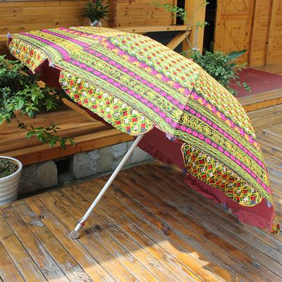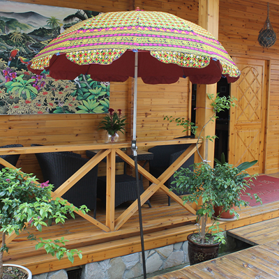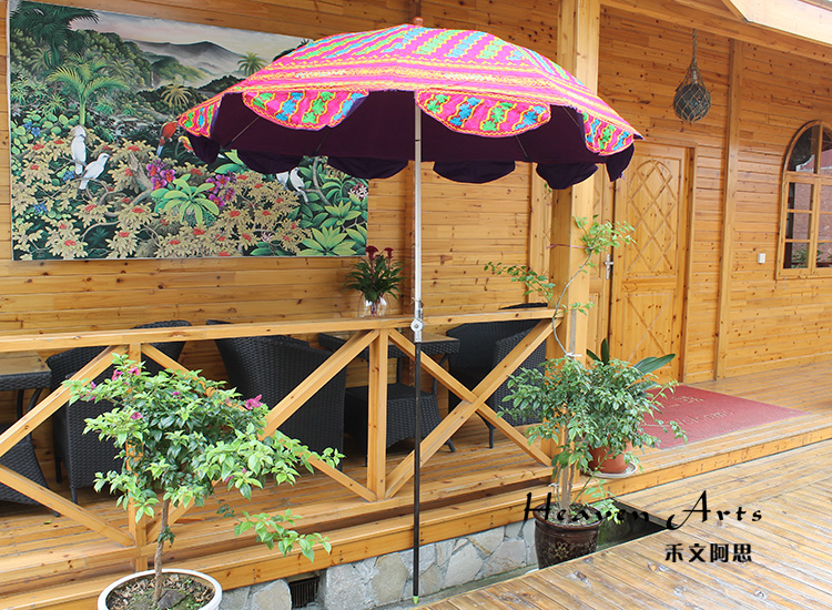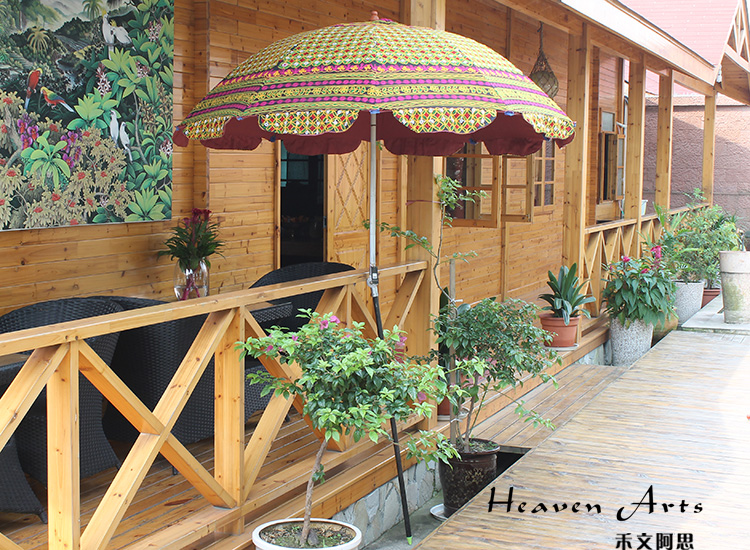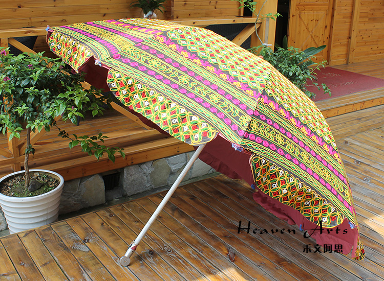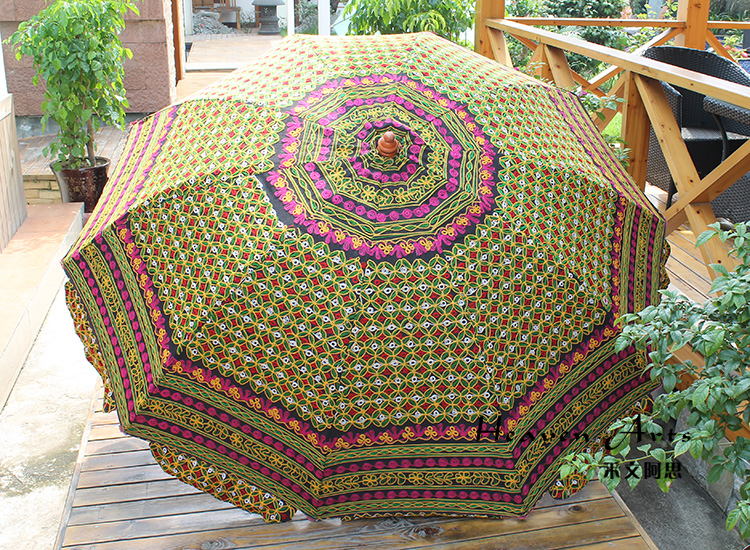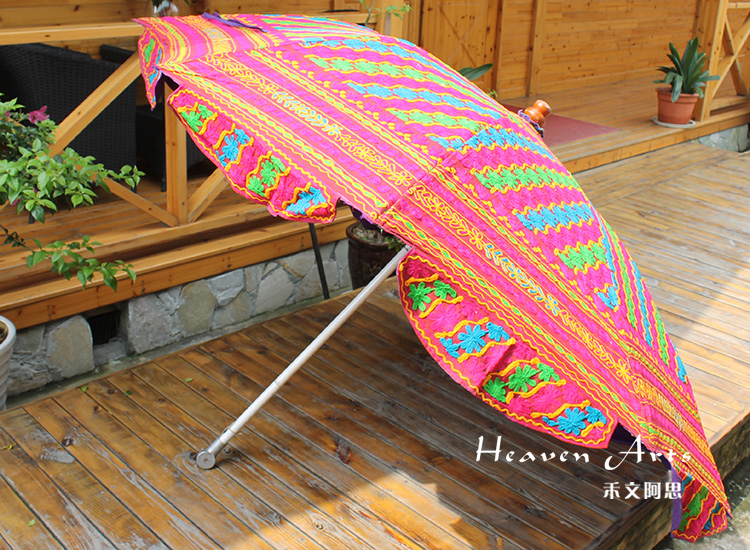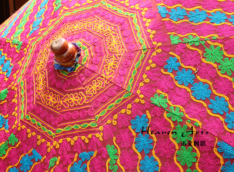 印度手工绣花太阳伞将这一奇妙艺术于阳光下灿烂绽放。2014年9月17日习近平主席的印度之行,将这种极具异域风情的太阳伞推上了时尚热门。禾文阿思印度太阳伞以手工在伞面上绣出各种雅致的图案,简约的花纹搭配缤纷绚丽的色彩,渲染出粹而热情的异域气息。不同花色的组合使太阳伞呈现不同的热情风味,加以弧形花边装饰,使伞的风味越发浪漫袭人。源自印度的古来手工绣花工艺,与时尚太阳伞融合,撑出一片灿烂的花样世界。