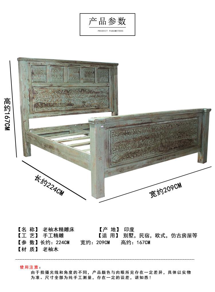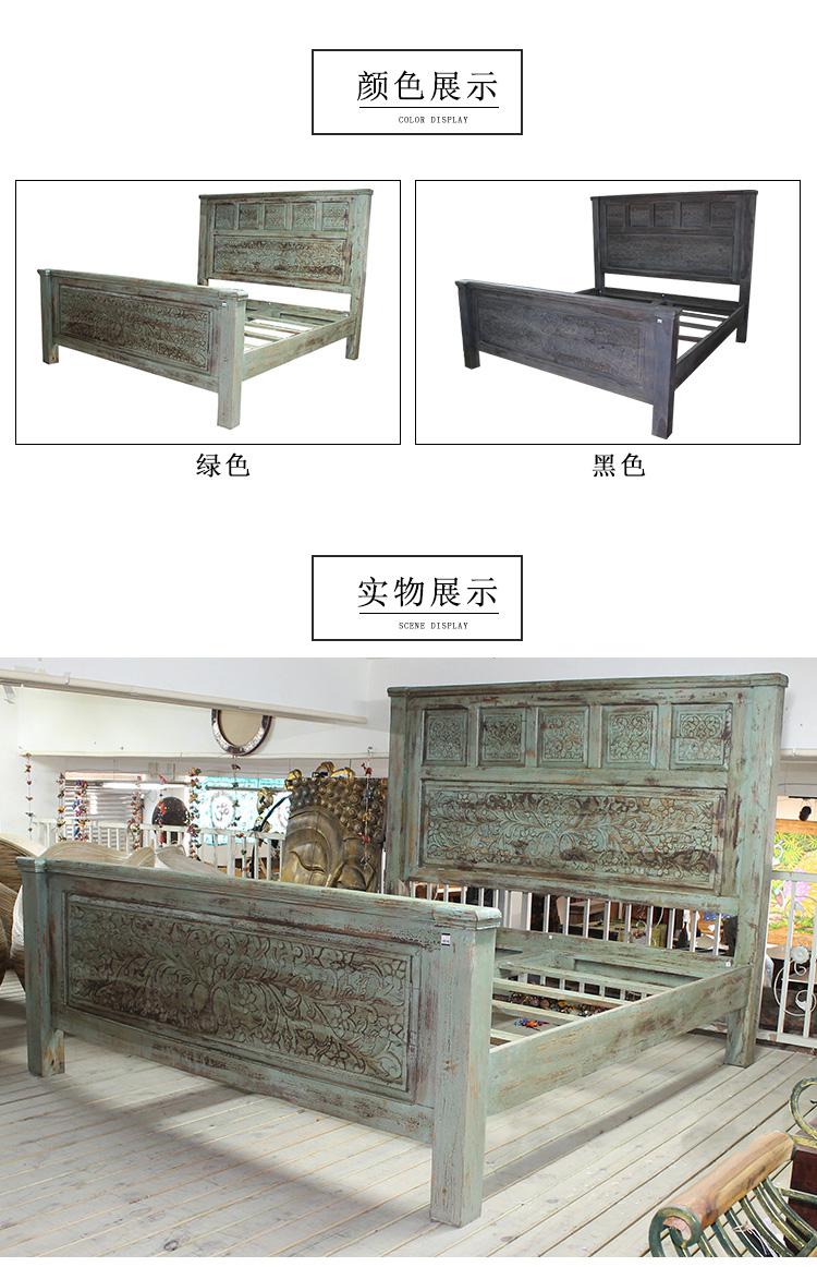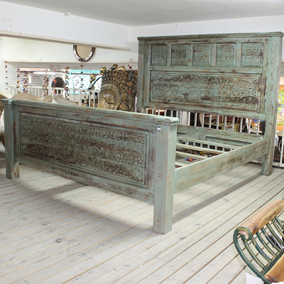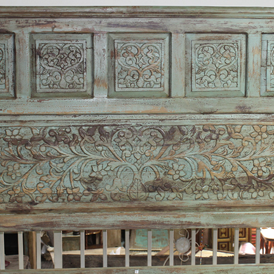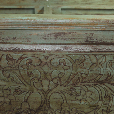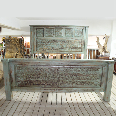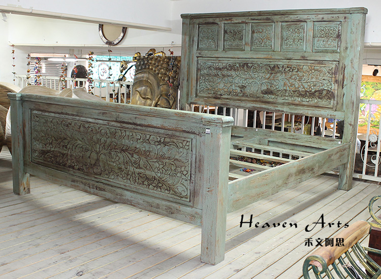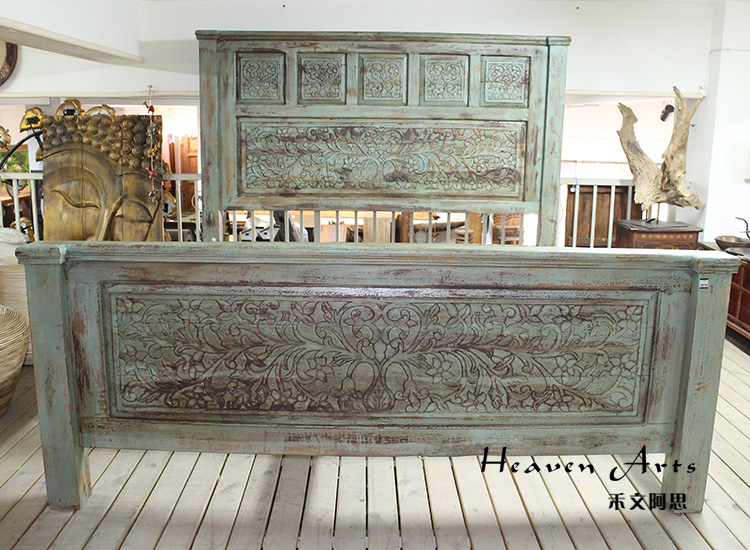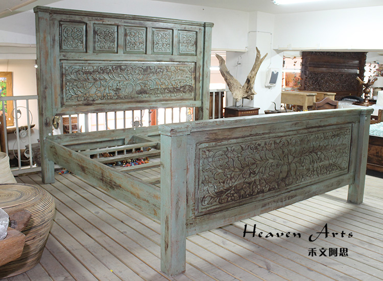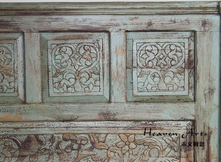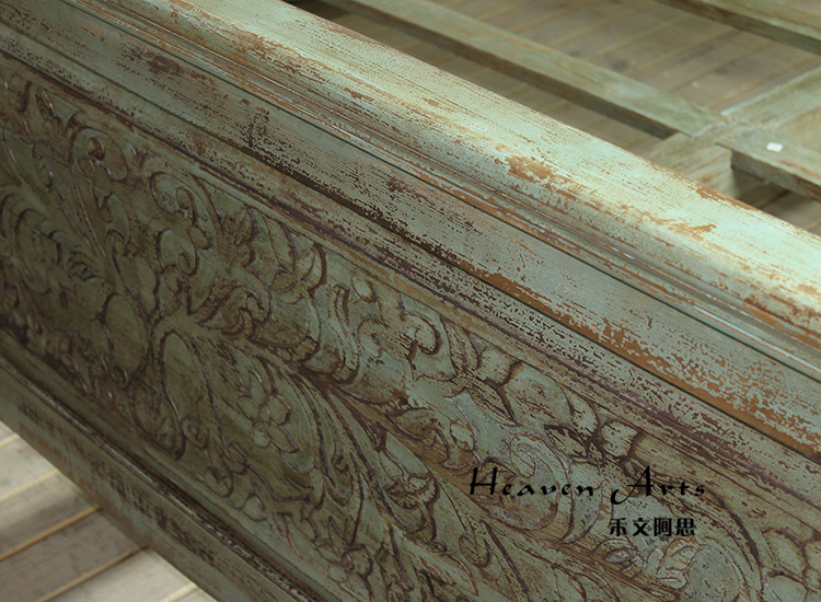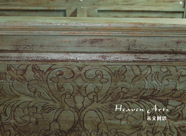 以粗犷的手法将彩绘融入传统之中的老柚木床,使其拥有古典高雅的韵味又不失文化魅力。传统的榫卯结构,再加上现代的钢钉螺帽,复古风老柚木床不仅拥有艺术美观的外在,同时拥有稳定牢靠的安全感。虽然没有光洁亮丽的外表,绿色彩绘的表面做旧的痕迹尤为明显,一道道沧桑的痕迹渲染出浓厚的古拙风情。床头与床尾的菩提蔓藤雕花,是极富印度民族特色的花纹,象征着祥和与智慧。造型古典艺术,风味沉稳大气的此款老柚木床传递出独特的文化气息,使复古之风变得优雅迷人。