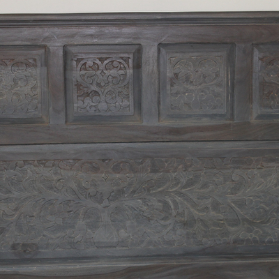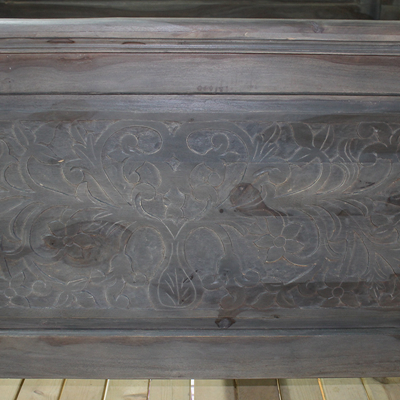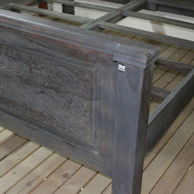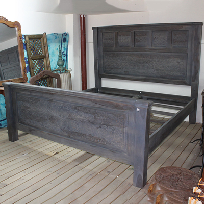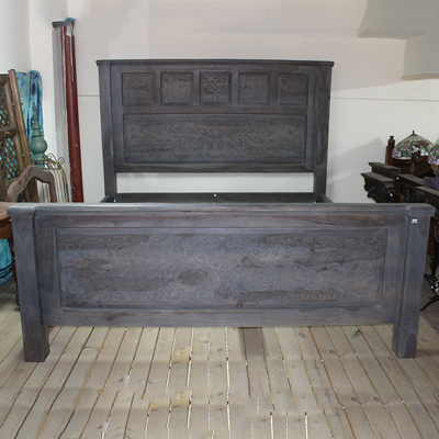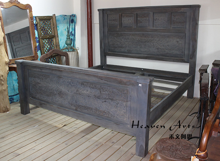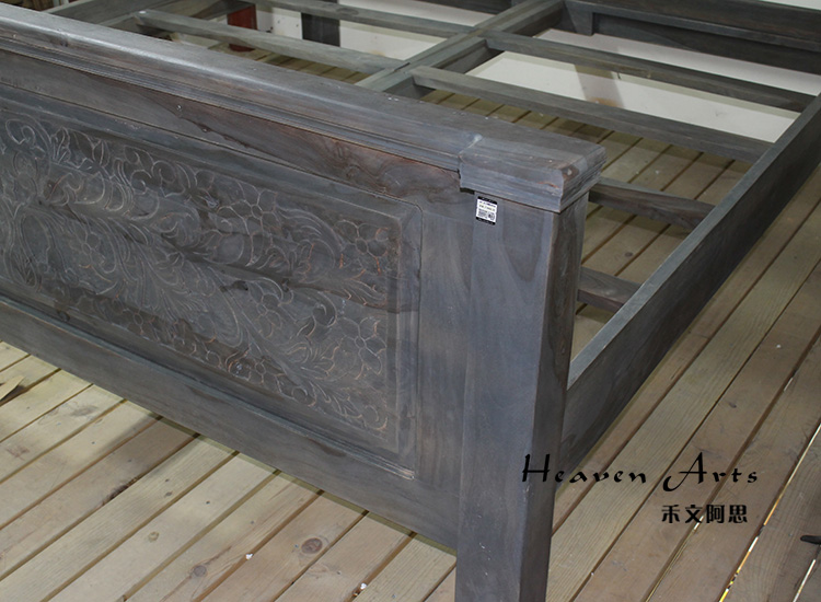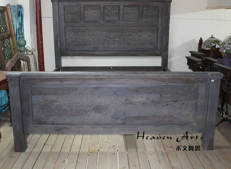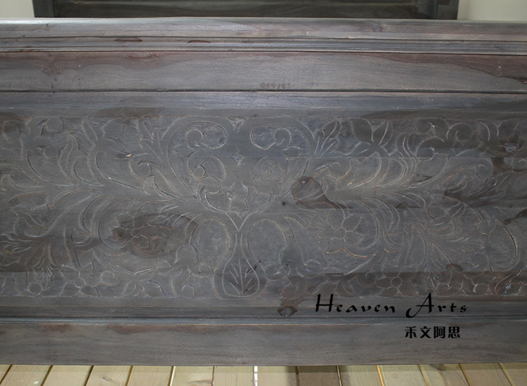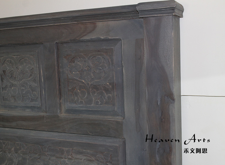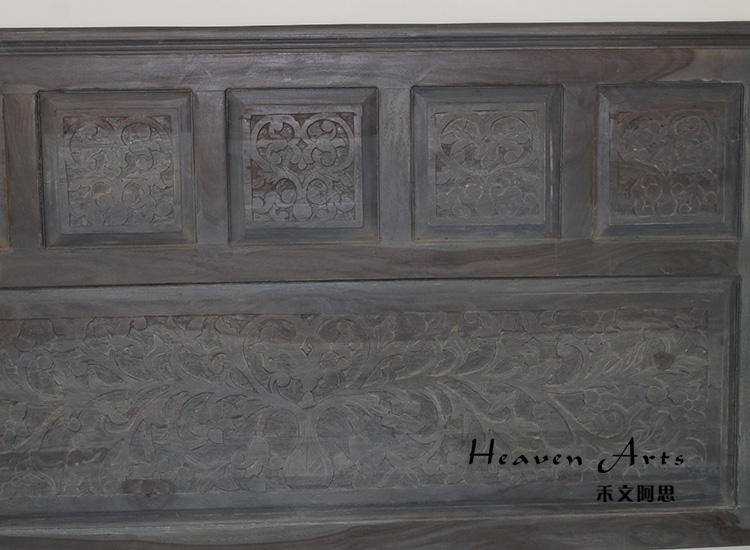 以粗犷的手法将彩绘融入传统之中的老柚木床,使其拥有古典高雅的韵味又不失文化魅力。传统的榫卯结构,再加上现代的钢钉螺帽,复古风老柚木床不仅拥有艺术美观的外在,同时拥有稳定牢靠的安全感。虽然没有光洁亮丽的外表,灰色彩绘的表面做旧的痕迹尤为明显,一道道沧桑的痕迹渲染出浓厚的古拙风情。床头与床尾的菩提蔓藤雕花,是极富印度民族特色的花纹,象征着祥和与智慧。造型古典艺术,风味沉稳大气的此款老柚木床传递出独特的文化气息,使复古之风变得优雅迷人。