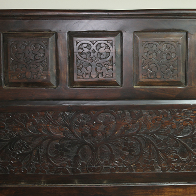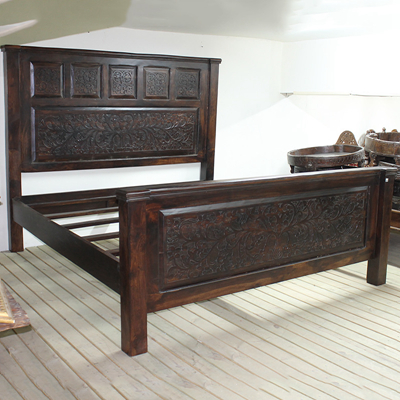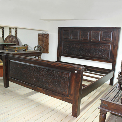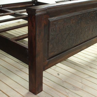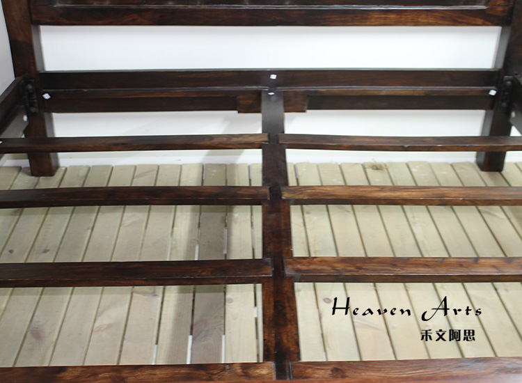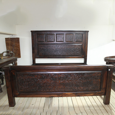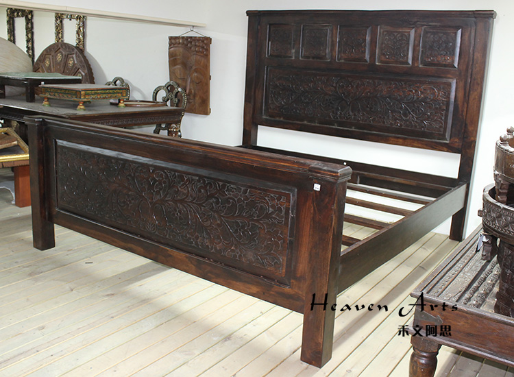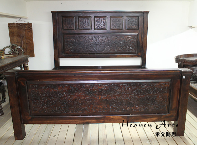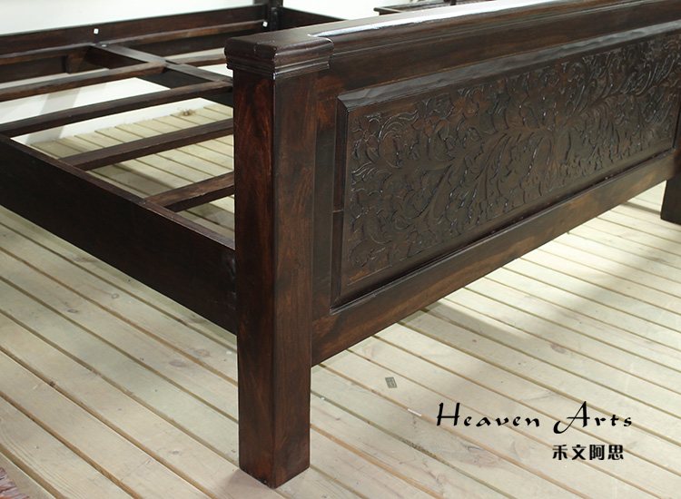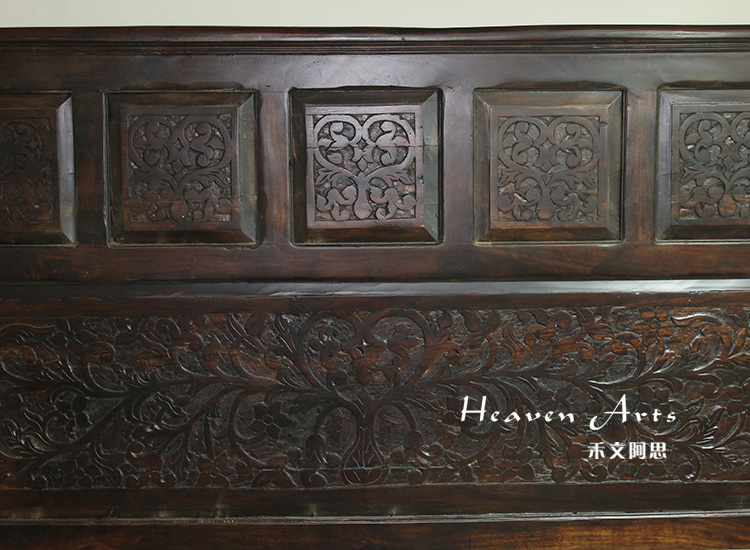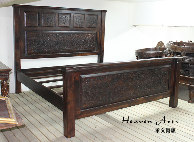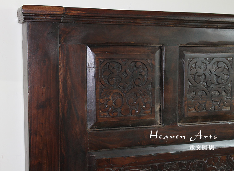 以粗犷的手法将彩绘融入传统之中的老柚木床,使其拥有古典高雅的韵味又不失文化魅力。传统的榫卯结构,再加上现代的钢钉螺帽,复古风老柚木床不仅拥有艺术美观的外在,同时拥有稳定牢靠的安全感。虽然没有光洁亮丽的外表,咖啡色彩绘的表面做旧的痕迹尤为明显,一道道沧桑的痕迹渲染出浓厚的古拙风情。床头与床尾的菩提蔓藤雕花,是极富印度民族特色的花纹,象征着祥和与智慧。造型古典艺术,风味沉稳大气的此款老柚木床传递出独特的文化气息,使复古之风变得优雅迷人。