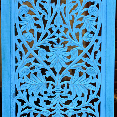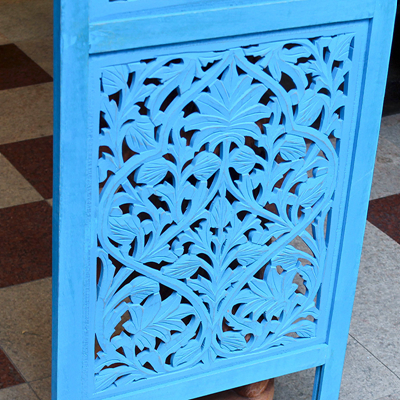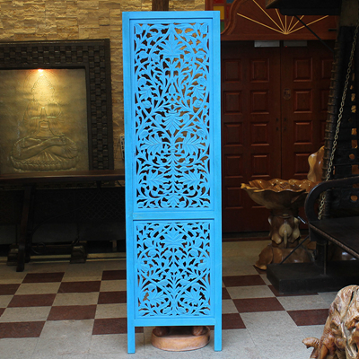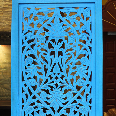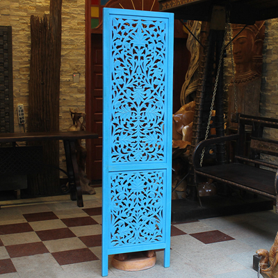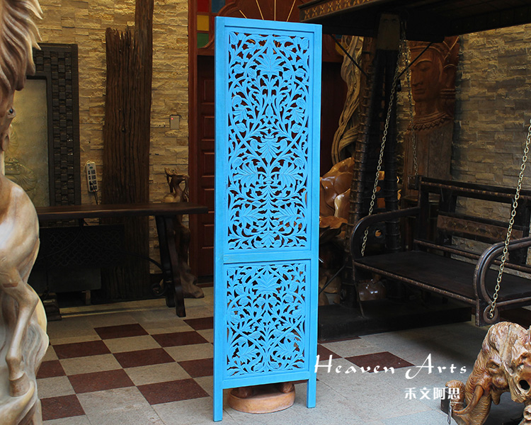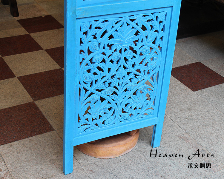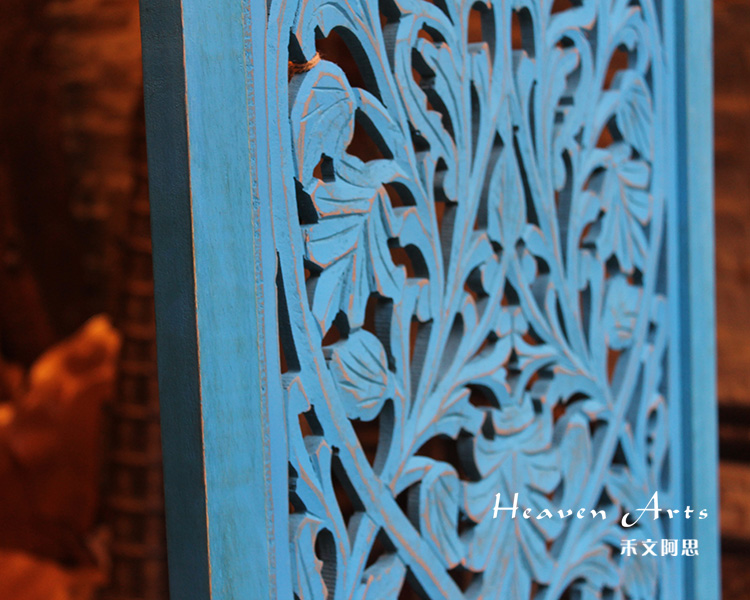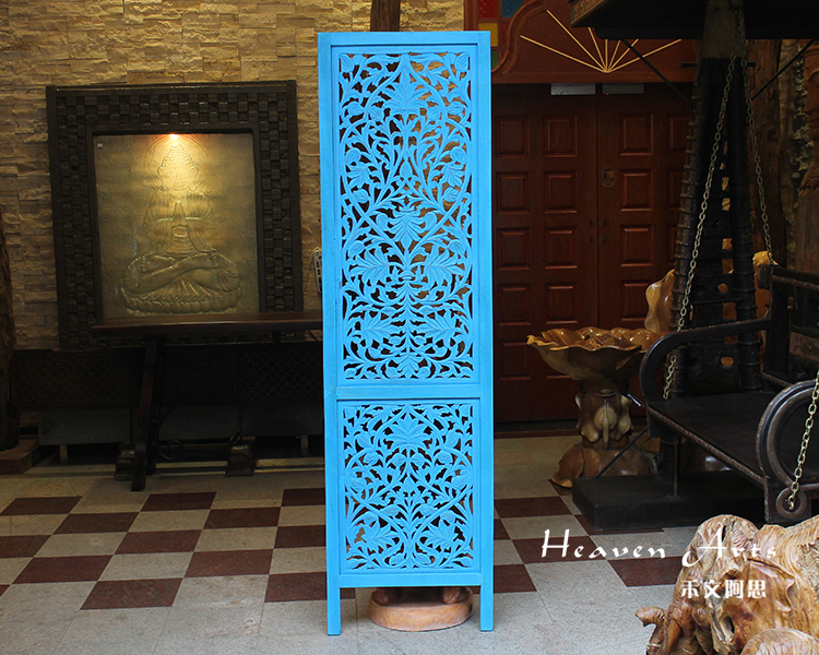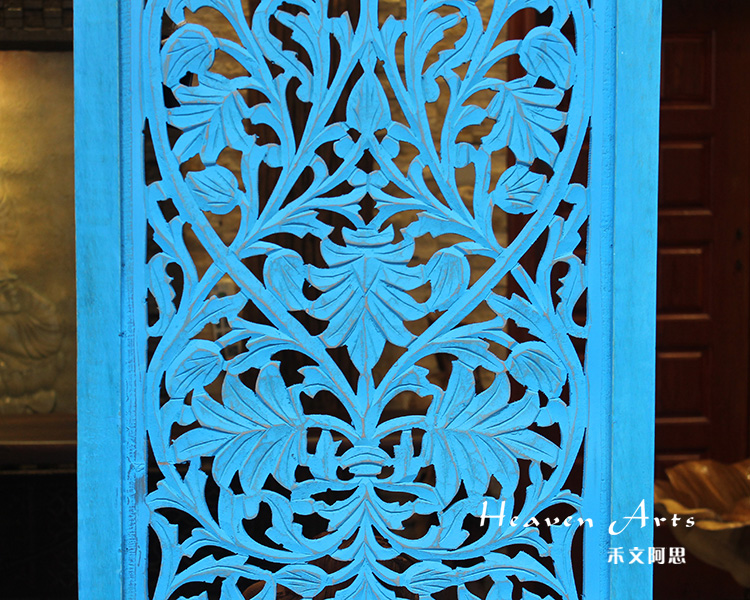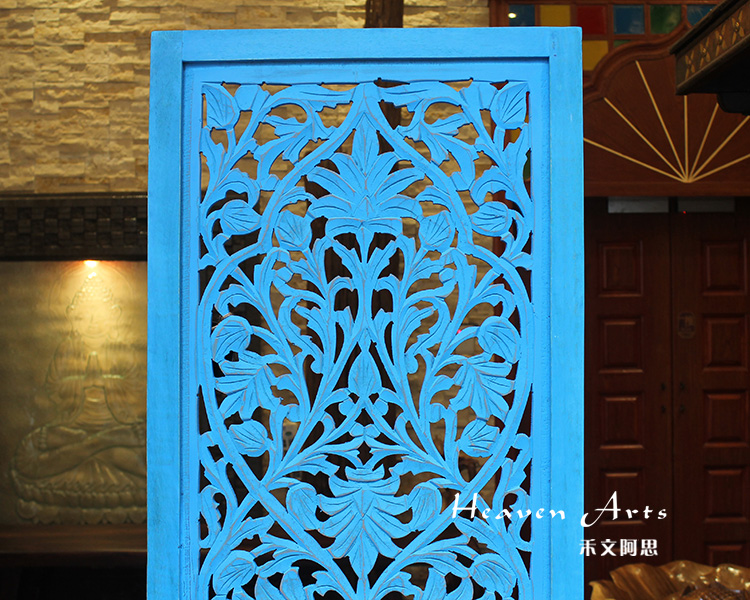 屏风是家居装饰不可分割的整体,能呈现出一种和谐之美、宁静之美,集实用性。欣赏性于一体,使极具民族传统特色的手工艺精品。半米宽的芒果木精雕单片屏风,镂空雕花极为精美雅致。以蓝漆着色的屏风分为上下两个部分,同样的雕花却分段呈现,别有一番雅致韵味。手工雕刻的花纹,花盛叶茂十分迷人,传统花叶盘绕洋溢着印度本土风情。清新雅致的镂空花纹,稀稀疏疏的光线穿透,蒙上宁静美好的氛围。若再搭配上一些绿色植物,则更显静谧、温馨。