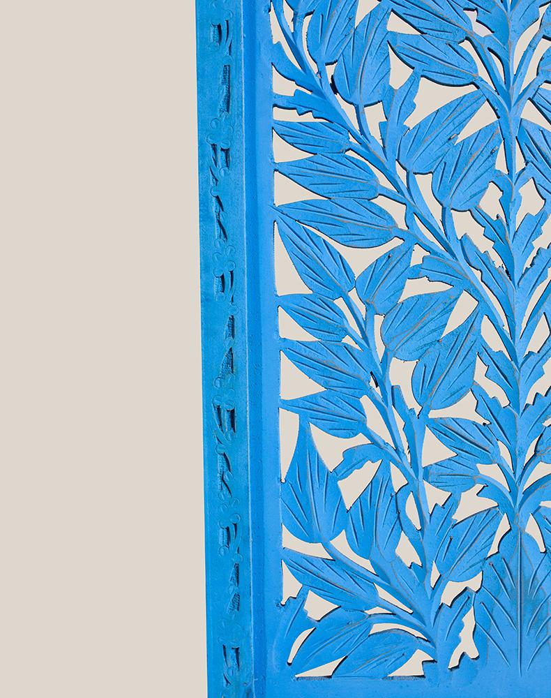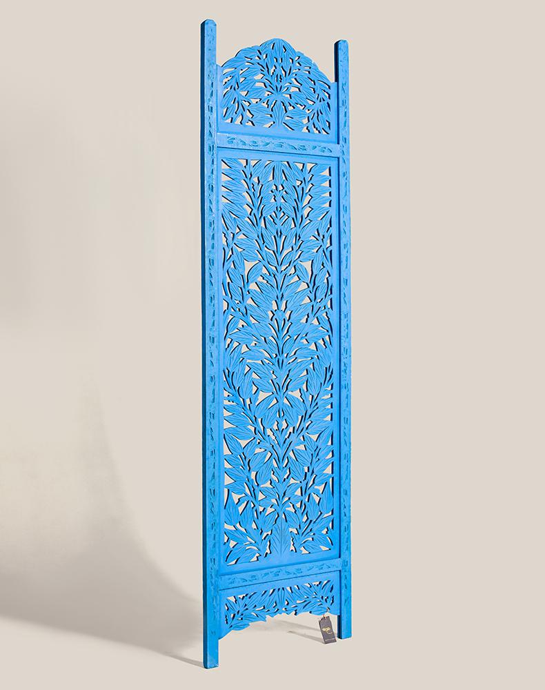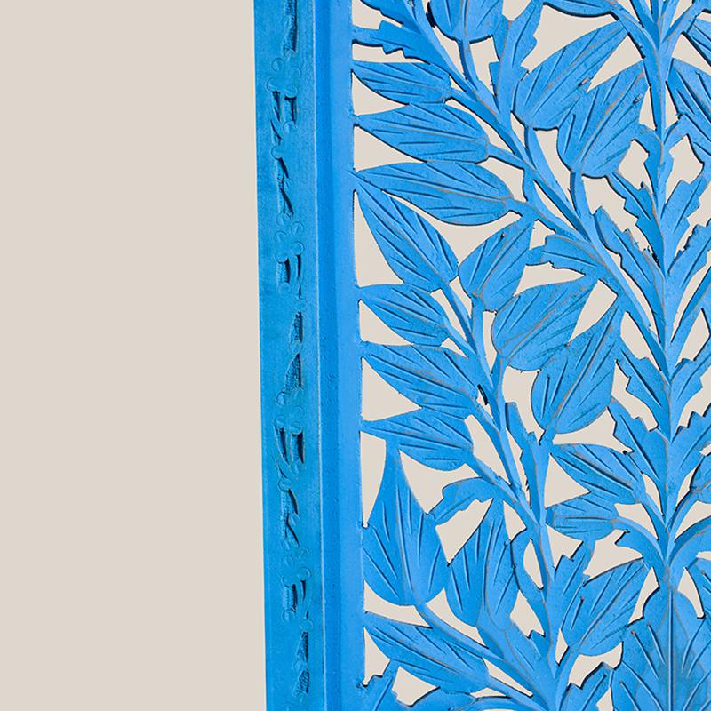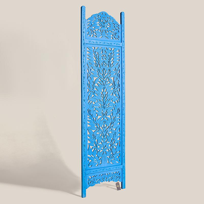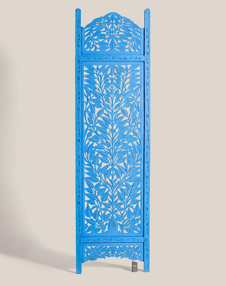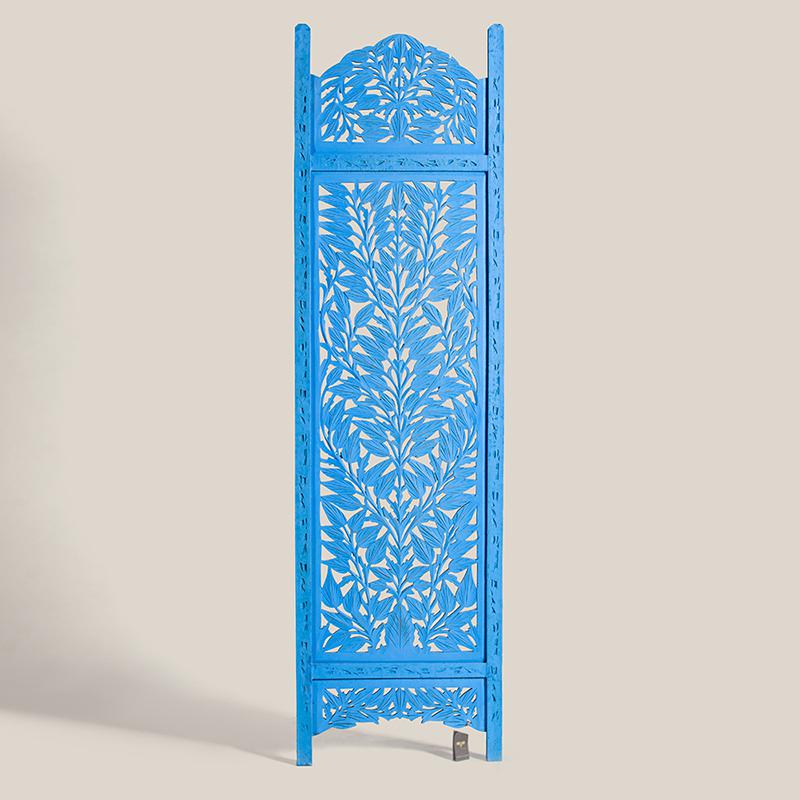 半米宽的单片精雕芒果木屏风,清新柳藤叶雕刻其上,呈现出一种和谐宁静之美。双面镂空雕刻的屏风,彰显着能工巧匠的非凡技艺,同时也赋予了屏风多角度观赏的精致美感。屏风顶上伊斯兰风情的宝顶样式,描绘出浪漫雅致的南亚之风。边框上的弧形雕花描绘出细节上的清美。手工雕刻的柳藤青叶,搭配镂空精致的雕琢,使稀稀疏疏的光线得以穿透,为芒果屏风蒙上清雅美好的氛围。极具民族传统特色的手工屏风,将清丽之美美凝聚其上,陈设在居室中自能营造一片自然美好。