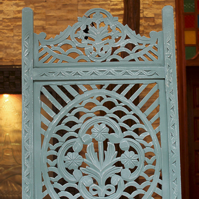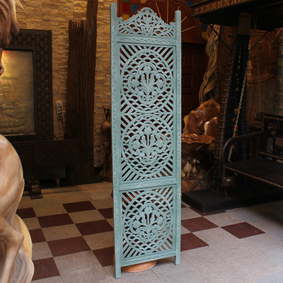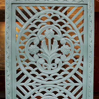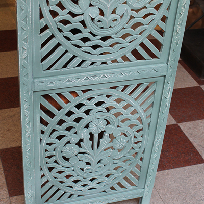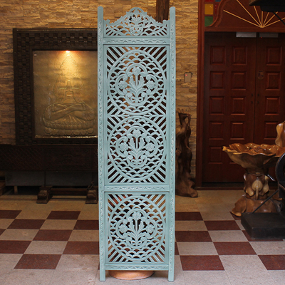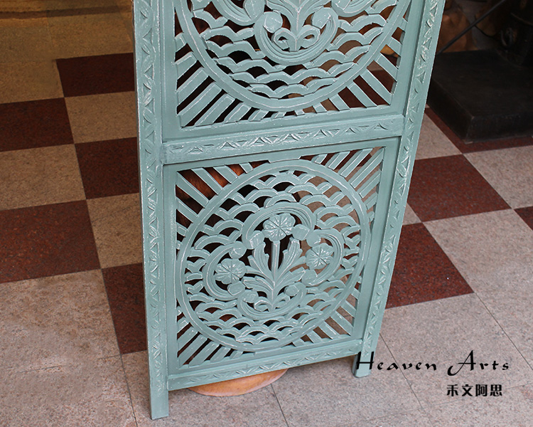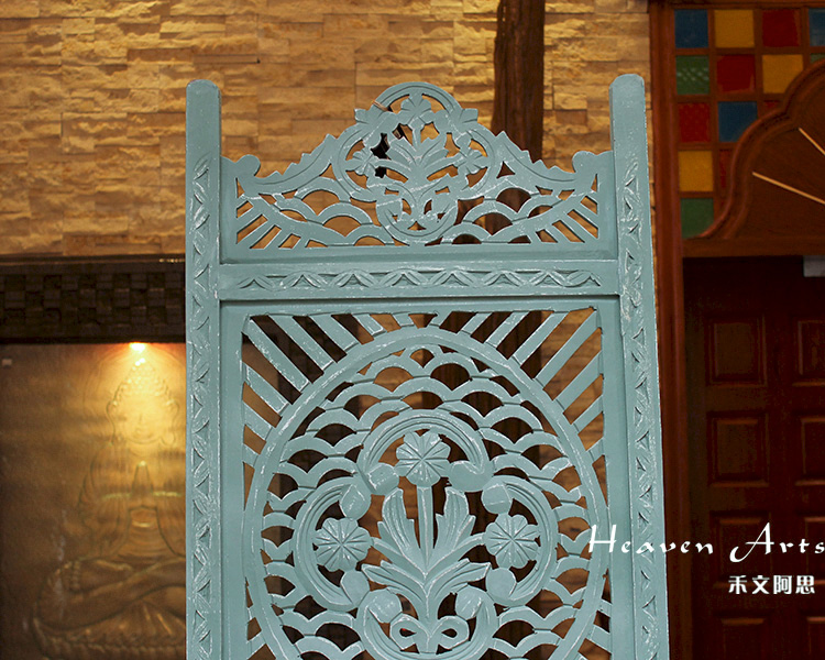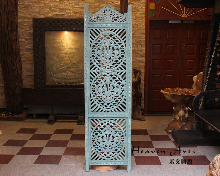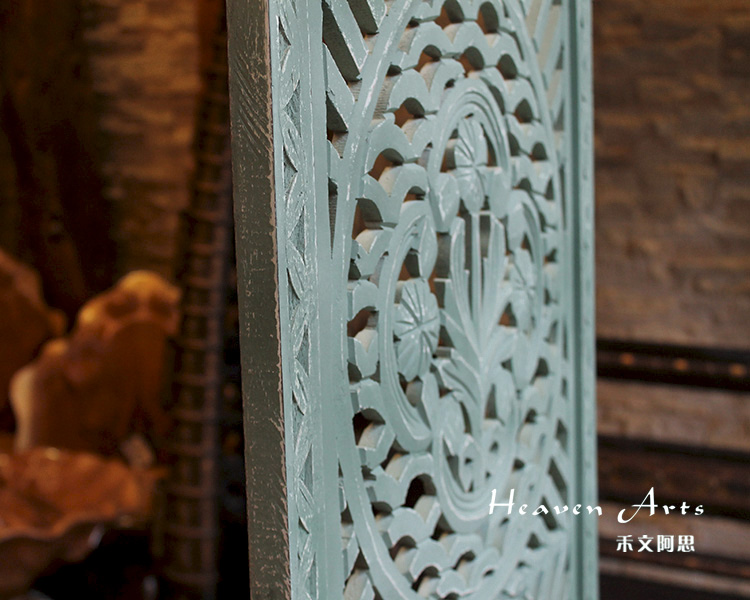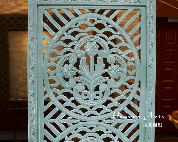 半米宽的单片精雕芒果木屏风,清新之花绽放其中,呈现出一种和谐宁静之美。双面镂空雕刻的花屏风,彰显着能工巧匠的非凡技艺,同时也赋予了屏风多角度观赏的精致美感。屏风顶上花边造型的宝顶样式,描绘出浪漫雅致的南亚之风。花顶之下的雕花形成三个别致的圆,圆内分别绽放枝繁叶茂的花,花叶繁盛清新,美感十足。同时条纹与波浪纹的相互搭配,将几何元素演绎的异常清美,而边框上的三角雕花,则使屏风的细节也趋于完美。手工雕刻的花卉,搭配镂空精致的雕琢,使稀稀疏疏的光线得以穿透,为芒果屏风蒙上清雅美好的氛围。