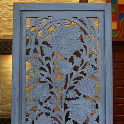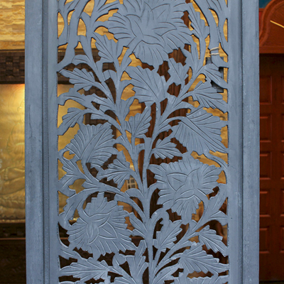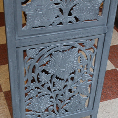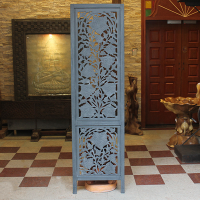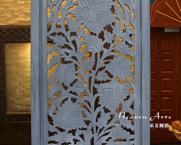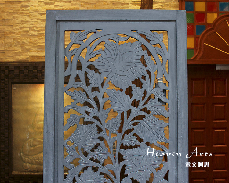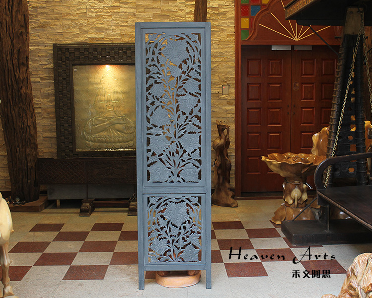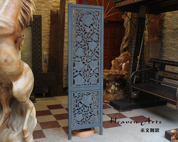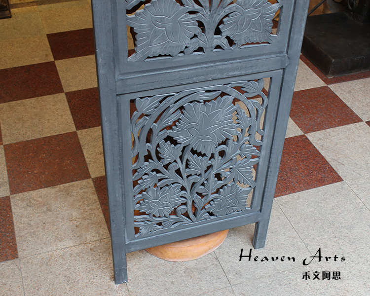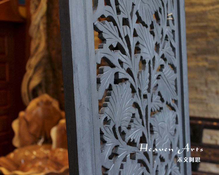 屏风是家居装饰不可分割的整体,能呈现出一种和谐之美、宁静之美,集实用性。欣赏性于一体,使极具民族传统特色的手工艺精品。半米宽的芒果木精雕单片屏风,镂空雕花极为精美雅致。以蓝漆着色的屏风分为上下两个部分,同样的枫叶雕花却分段呈现,别有一番雅致韵味。手工雕刻的花纹,花盛叶茂十分迷人,传统花叶盘绕洋溢着印度本土风情。清新雅致的镂空花纹,稀稀疏疏的光线穿透,蒙上宁静美好的氛围。若再搭配上一些绿色植物,则更显静谧、温馨。