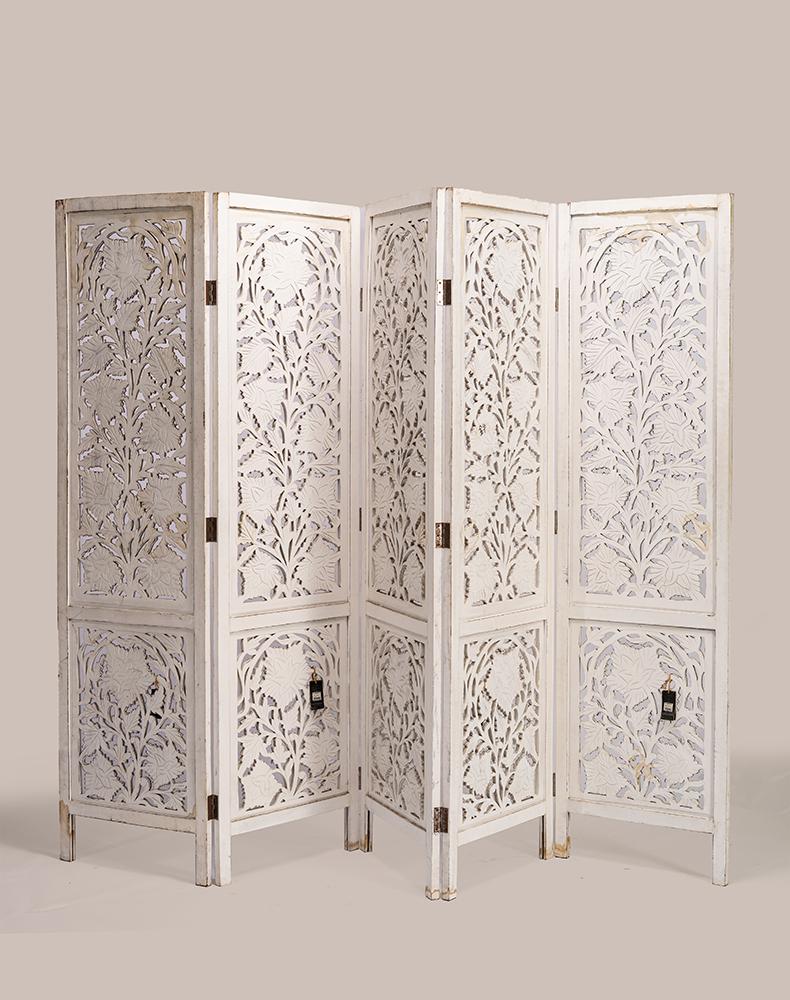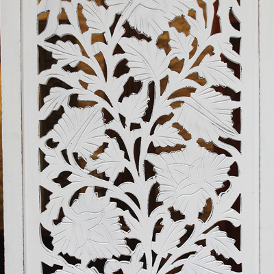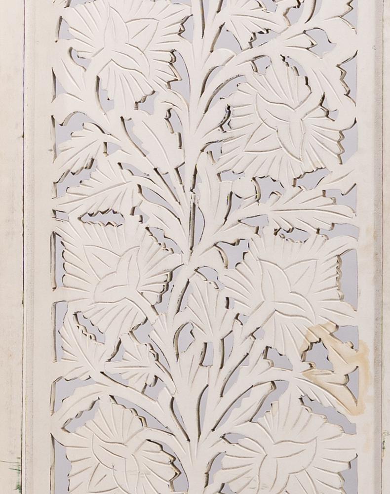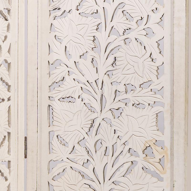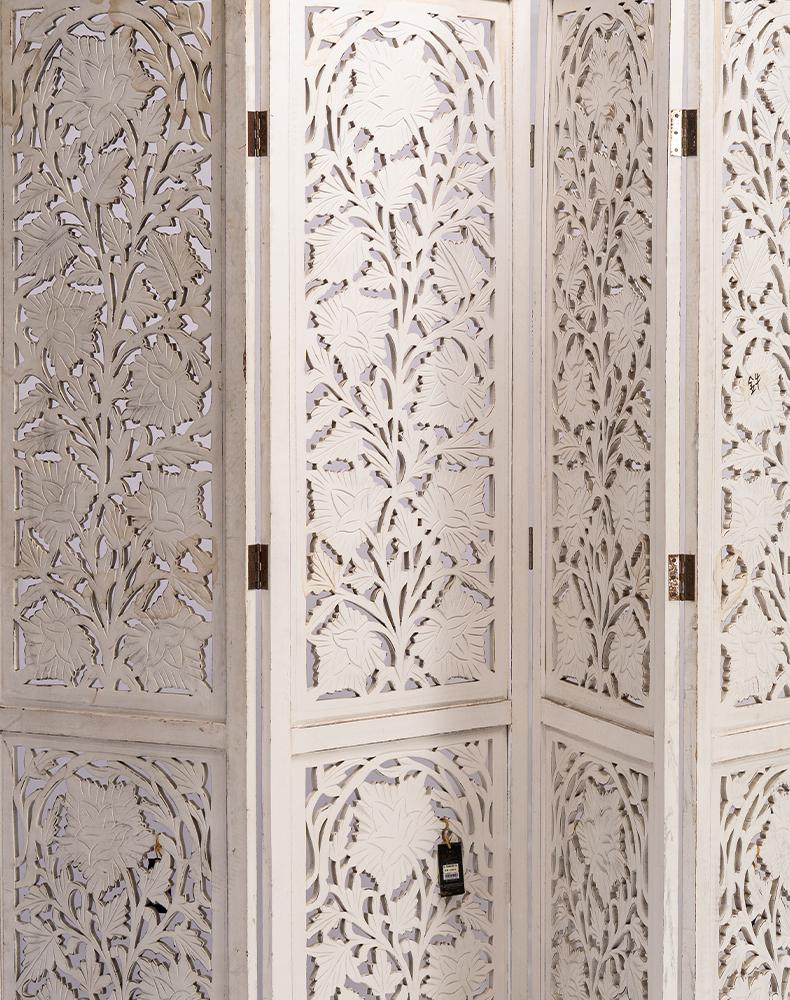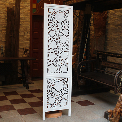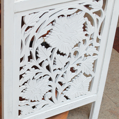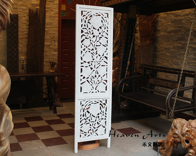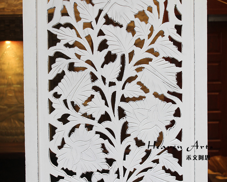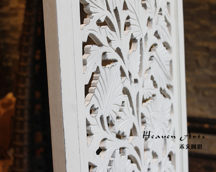 屏风是家居装饰不可分割的整体,能呈现出一种和谐之美、宁静之美,集实用性。欣赏性于一体,使极具民族传统特色的手工艺精品。半米宽的芒果木精雕单片屏风,镂空雕花极为精美雅致。以白漆着色的屏风分为上下两个部分,同样的枫叶雕花却分段呈现,别有一番雅致韵味。手工雕刻的花纹,花盛叶茂十分迷人,传统花叶盘绕洋溢着印度本土风情。清新雅致的镂空花纹,稀稀疏疏的光线穿透,蒙上宁静美好的氛围。若再搭配上一些绿色植物,则更显静谧、温馨。