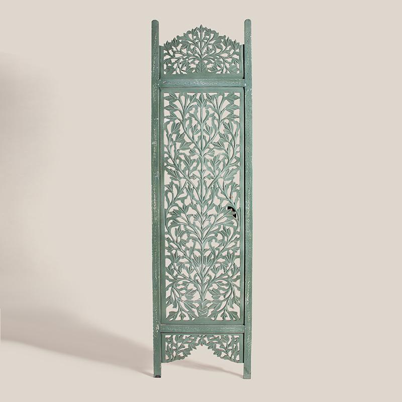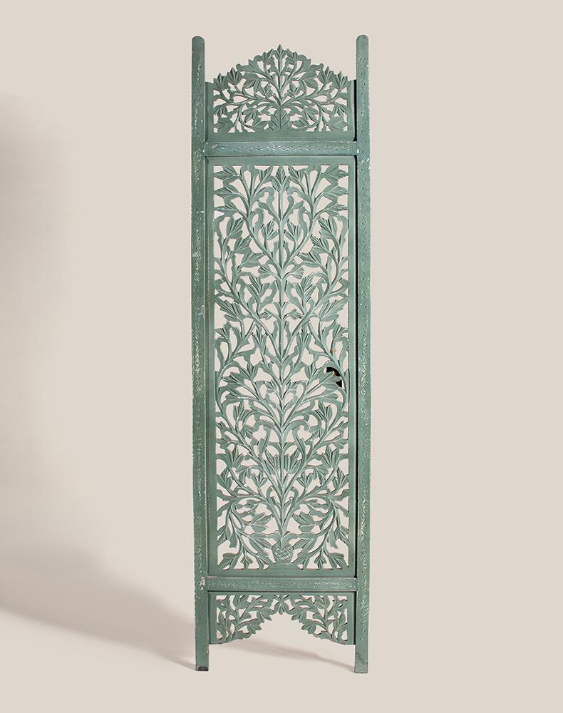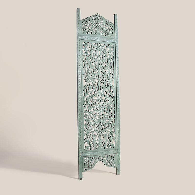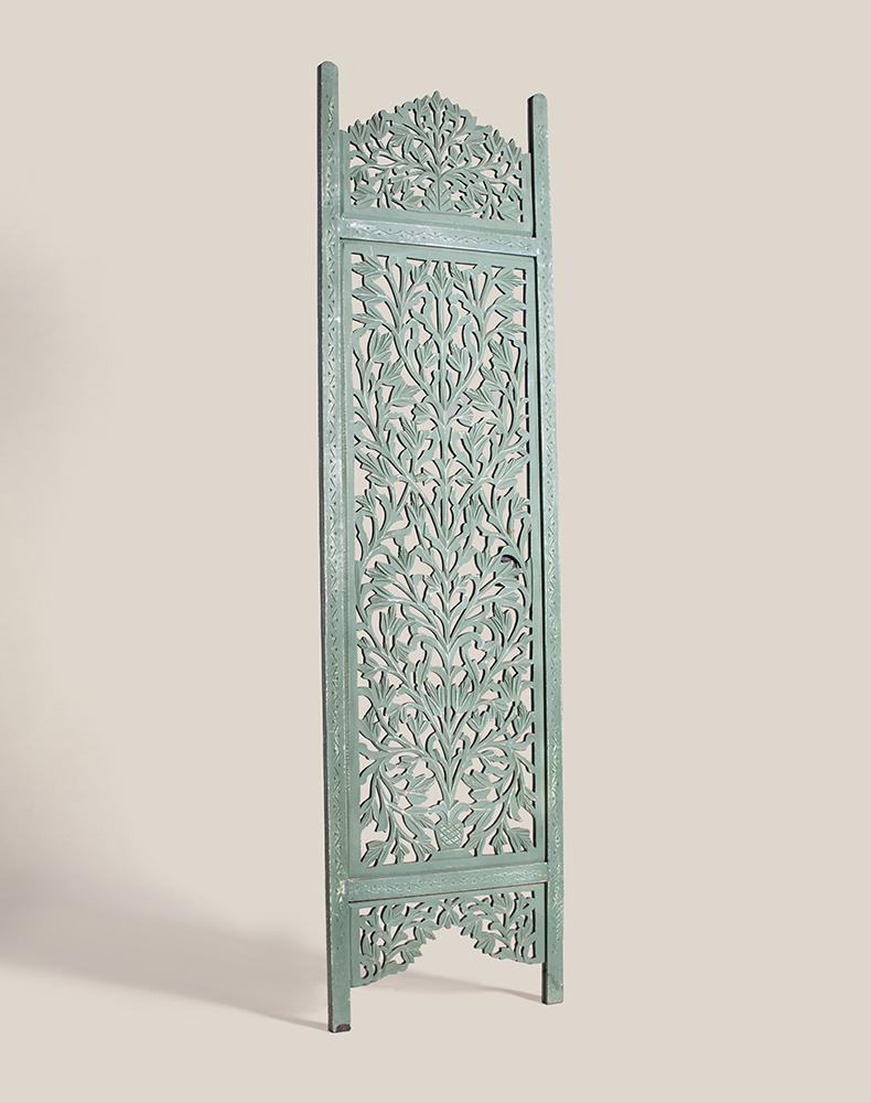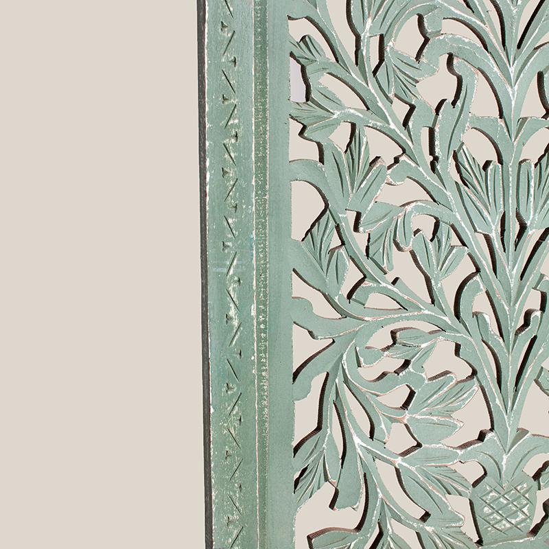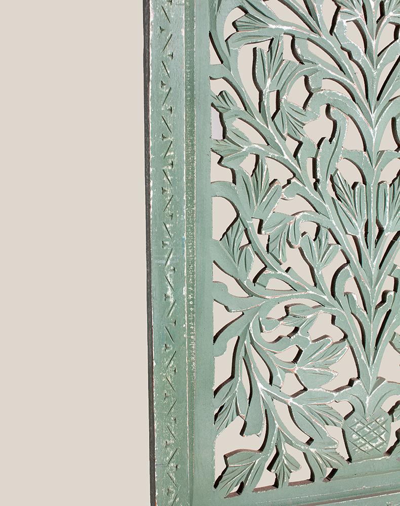 半米宽的单片精雕芒果木屏风,清新叶卉花纹雕刻其上,呈现出一种和谐宁静之美。双面镂空雕刻的屏风,彰显着能工巧匠的非凡技艺,同时也赋予了屏风多角度观赏的精致美感。屏风顶上伊斯兰风情的宝顶样式,描绘出浪漫雅致的南亚之风。整体雕刻皆采用海浪花纹,统一的造型在海浪层叠之中,尽显十足美感。边框上的弧形雕花描绘出细节上的清美。手工雕刻的树枝青叶,搭配镂空精致的雕琢,使稀稀疏疏的光线得以穿透,为芒果屏风蒙上清雅美好的氛围。极具民族传统特色的手工屏风,将清丽之美美凝聚其上,陈设在居室中自能营造一片自然美好。
