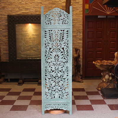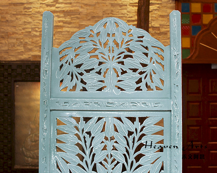 半米宽的单片精雕芒果木屏风,清新柳藤叶雕刻其上,呈现出一种和谐宁静之美。双面镂空雕刻的屏风,彰显着能工巧匠的非凡技艺,同时也赋予了屏风多角度观赏的精致美感。屏风顶上伊斯兰风情的宝顶样式,描绘出浪漫雅致的南亚之风。边框上的弧形雕花描绘出细节上的清美。手工雕刻的柳藤青叶,搭配镂空精致的雕琢,使稀稀疏疏的光线得以穿透,为芒果屏风蒙上清雅美好的氛围。极具民族传统特色的手工屏风,将清丽之美美凝聚其上,陈设在居室中自能营造一片自然美好。