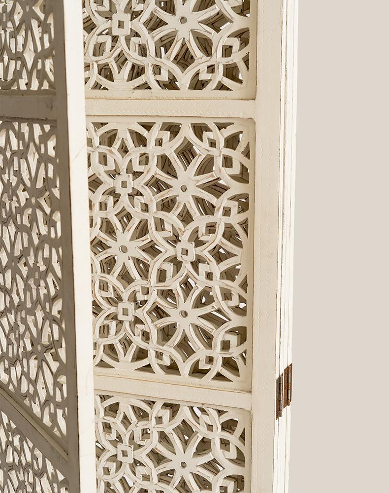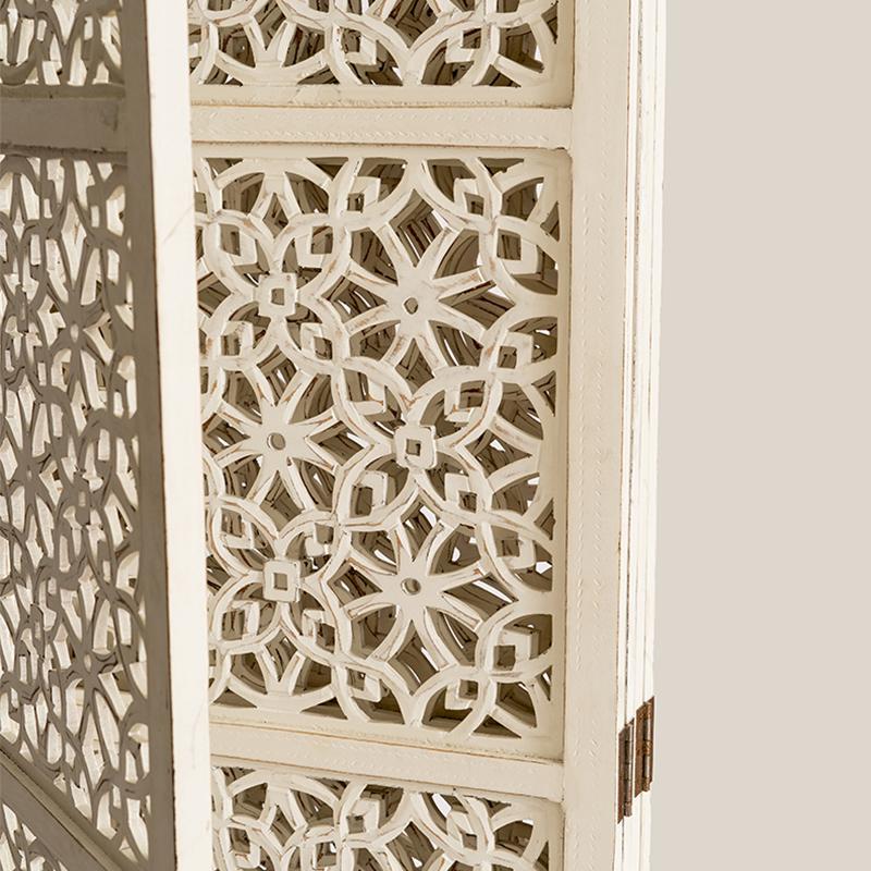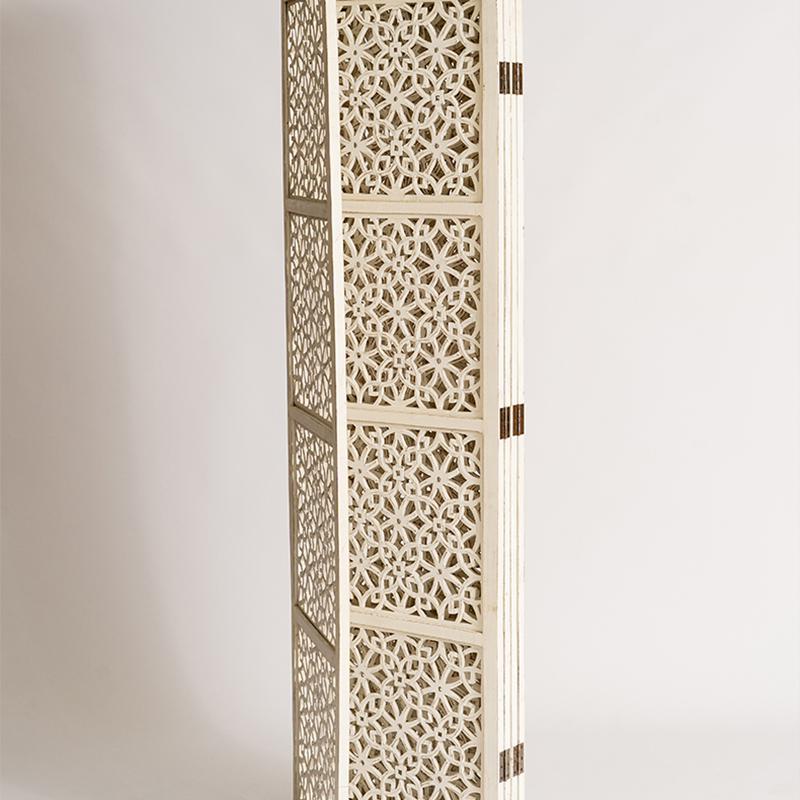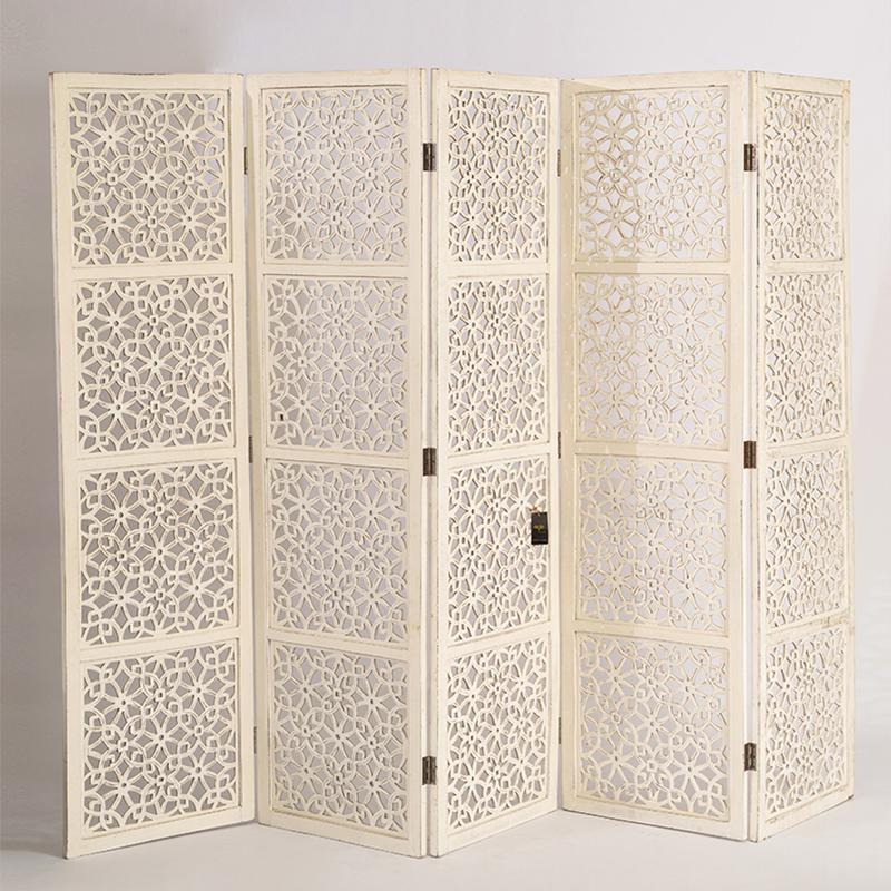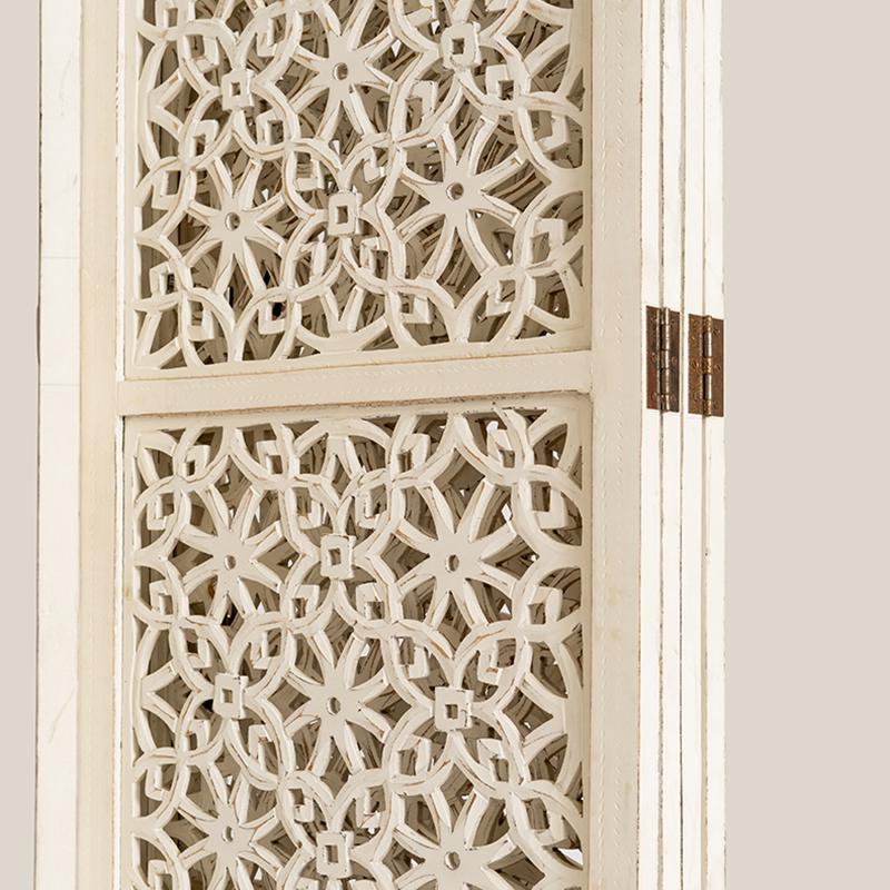 半米宽的单片精雕芒果木屏风,清新几何花纹雕刻其上,呈现出一种和谐宁静之美。双面镂空雕刻的花屏风,彰显着能工巧匠的非凡技艺,同时也赋予了屏风多角度观赏的精致美感。干净利落的方正边框线条,使屏风透着庄严秀美之感。整体雕刻皆采用繁复花纹,统一而富有变化的花纹,尽显十足美感。手工雕刻的万花,搭配镂空精致的雕琢,使稀稀疏疏的光线得以穿透,为芒果屏风蒙上清雅美好的氛围。极具民族传统特色的手工屏风,将清丽之美美凝聚其上,陈设在居室中自能营造一片自然美好。