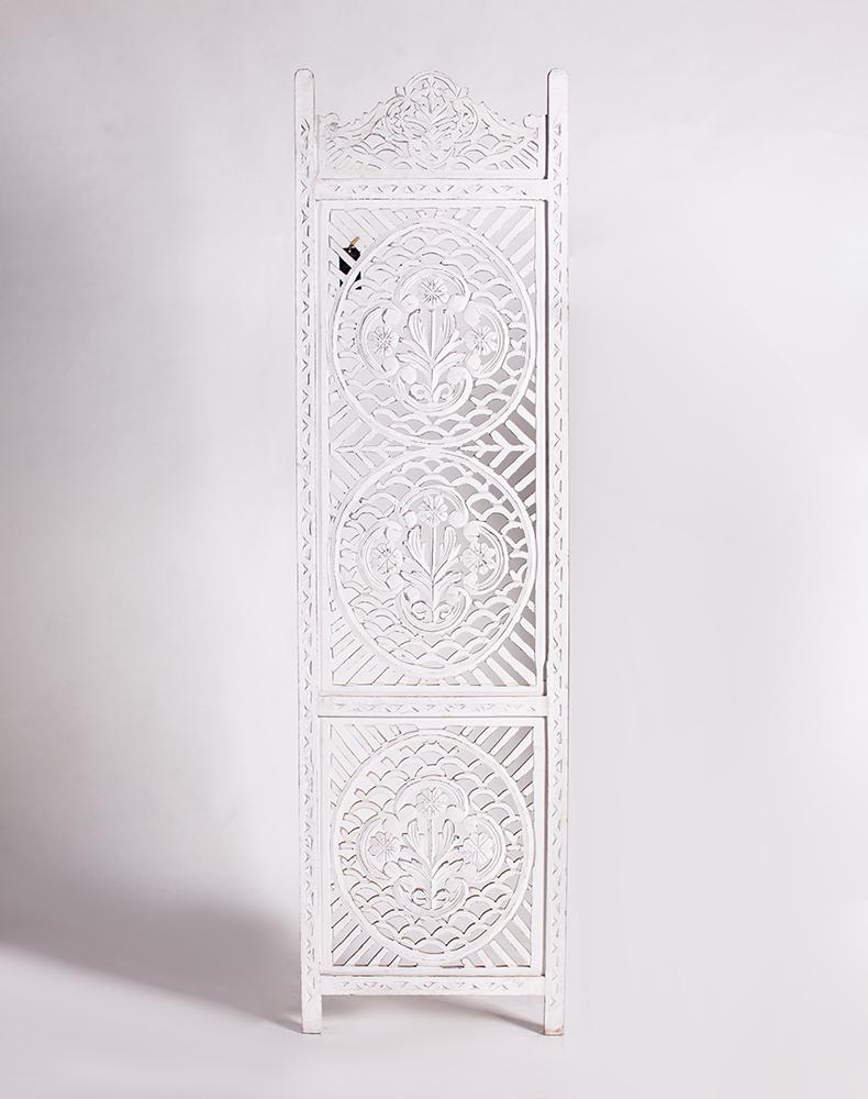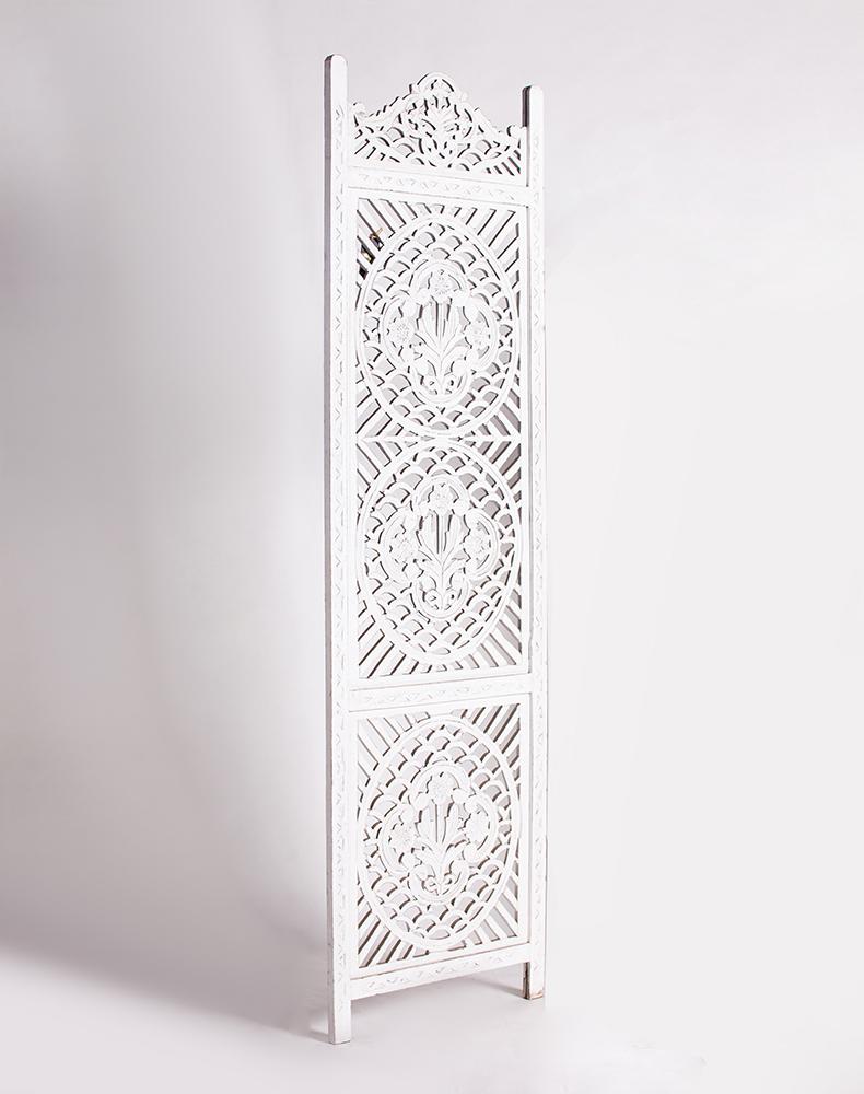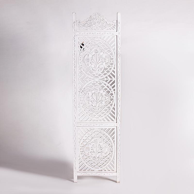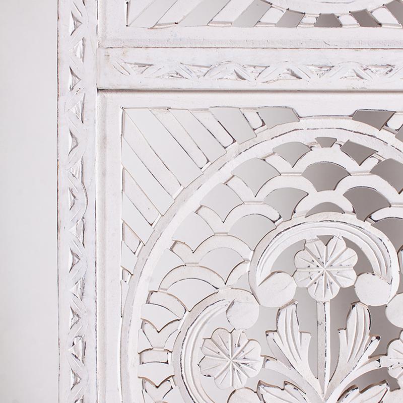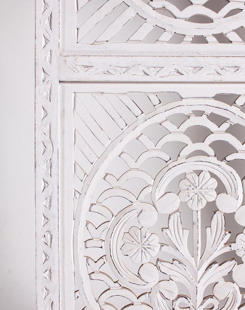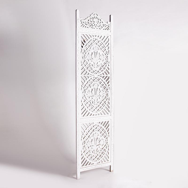半米宽的单片精雕芒果木屏风,清新叶卉花纹雕刻其上,呈现出一种和谐宁静之美。双面镂空雕刻的屏风,彰显着能工巧匠的非凡技艺,同时也赋予了屏风多角度观赏的精致美感。屏风顶上伊斯兰风情的宝顶样式,描绘出浪漫雅致的南亚之风。整体雕刻皆采用海浪花纹,统一的造型在海浪层叠之中,尽显十足美感。边框上的弧形雕花描绘出细节上的清美。手工雕刻的树枝青叶,搭配镂空精致的雕琢,使稀稀疏疏的光线得以穿透,为芒果屏风蒙上清雅美好的氛围。极具民族传统特色的手工屏风,将清丽之美美凝聚其上,陈设在居室中自能营造一片自然美好。