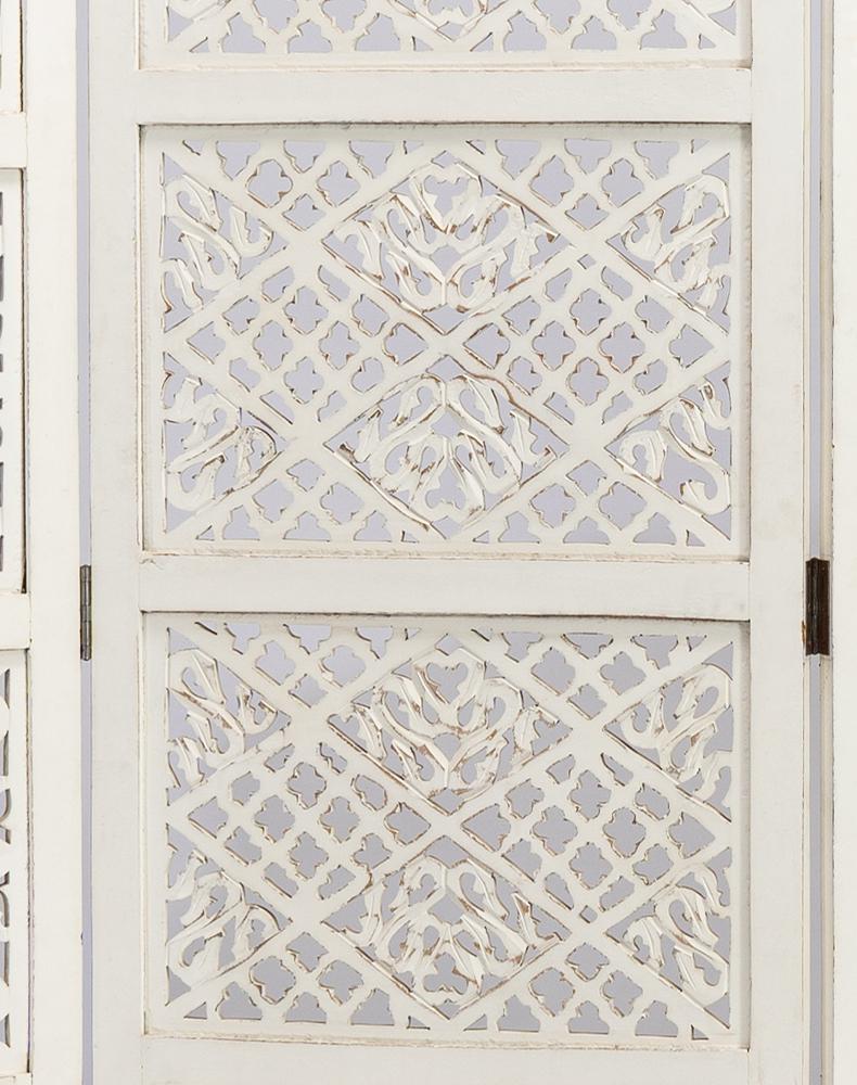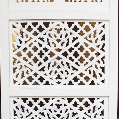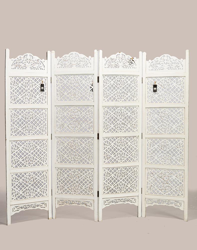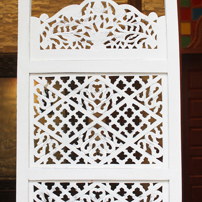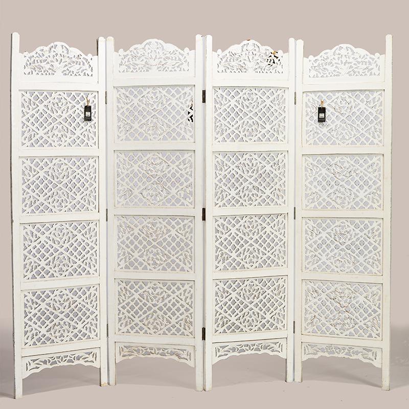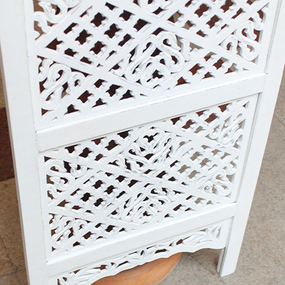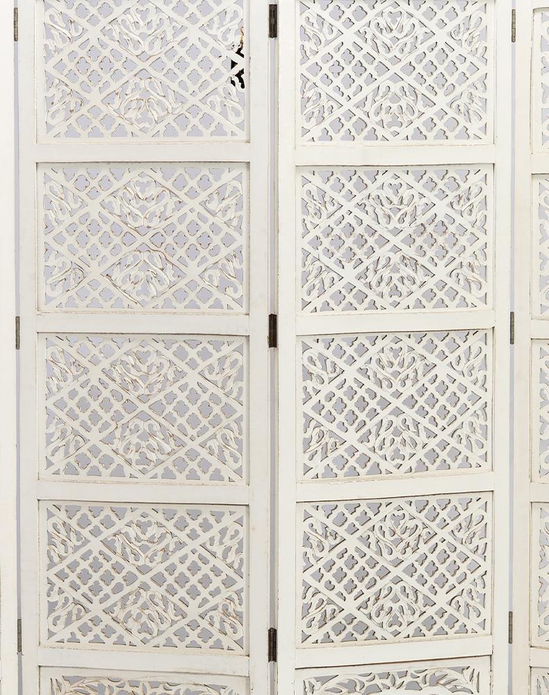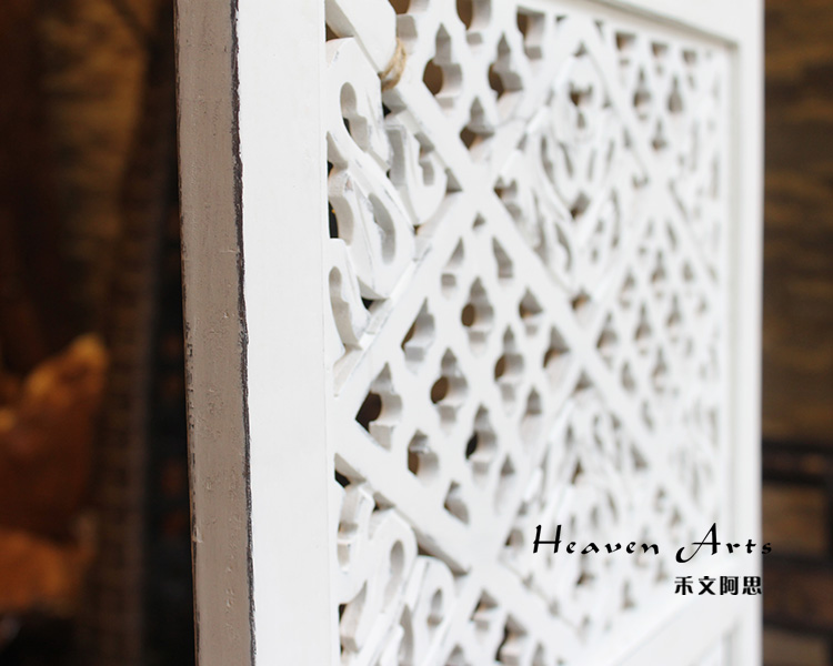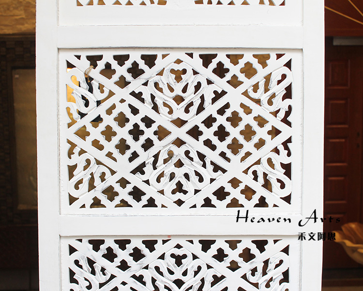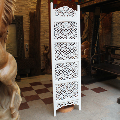 半米宽的单片精雕芒果木屏风,藤蔓雕花与几何格子交织其中,呈现出一种和谐宁静之美。双面镂空雕刻的花屏风,彰显着能工巧匠的非凡技艺,同时也赋予了屏风多角度观赏的精致美感。屏风顶上花边造型的宝顶样式,描绘出浪漫的南亚之风。花顶之下方正严谨的构图中,直线与曲线巧妙过渡,清雅而不失端庄大雅,将几何元素演绎的异常清美。手工雕刻的花卉,搭配镂空精致的雕琢,使稀稀疏疏的光线得以穿透,为芒果屏风蒙上清雅美好的氛围,而多扇屏风搭配使用的效果更甚。