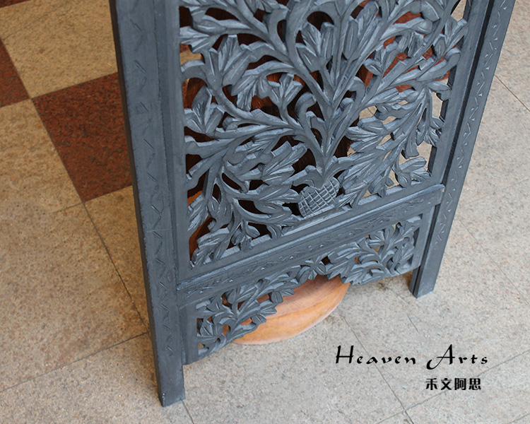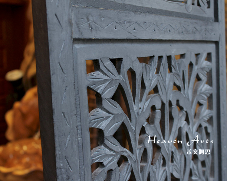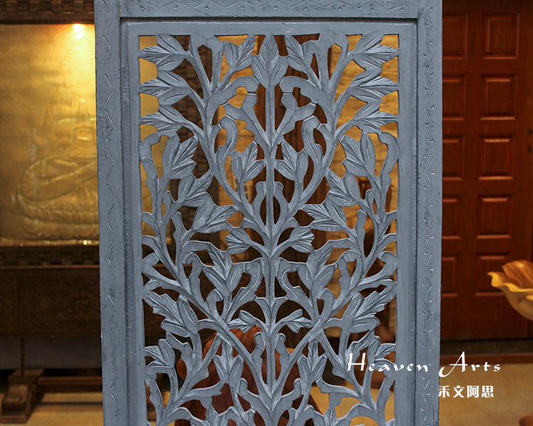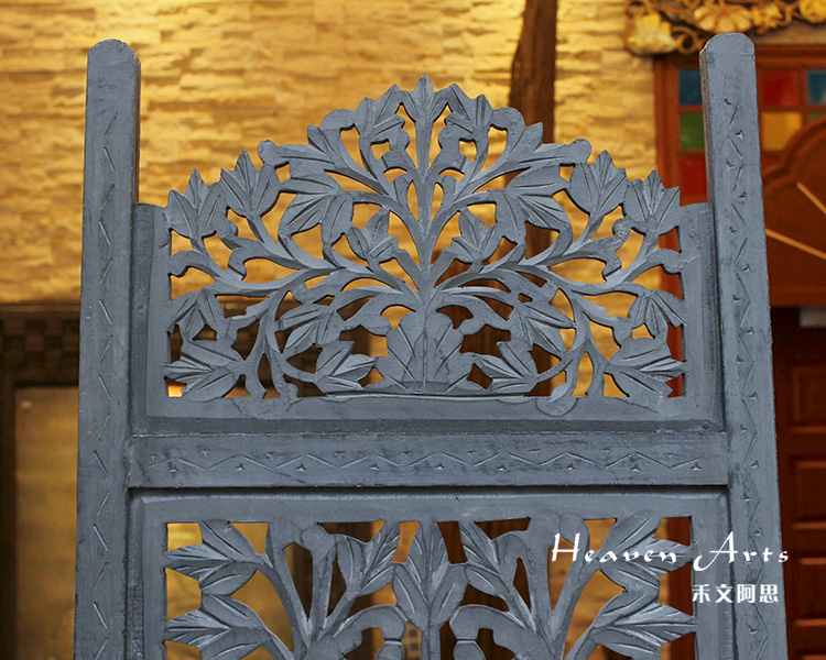 半米宽的单片精雕芒果木屏风,清新叶卉花纹雕刻其上,呈现出一种和谐宁静之美。双面镂空雕刻的屏风,彰显着能工巧匠的非凡技艺,同时也赋予了屏风多角度观赏的精致美感。屏风顶上伊斯兰风情的宝顶样式,描绘出浪漫雅致的南亚之风。整体雕刻皆采用海浪花纹,统一的造型在海浪层叠之中,尽显十足美感。边框上的弧形雕花描绘出细节上的清美。手工雕刻的树枝青叶,搭配镂空精致的雕琢,使稀稀疏疏的光线得以穿透,为芒果屏风蒙上清雅美好的氛围。极具民族传统特色的手工屏风,将清丽之美美凝聚其上,陈设在居室中自能营造一片自然美好。