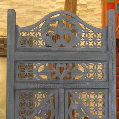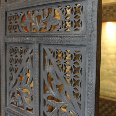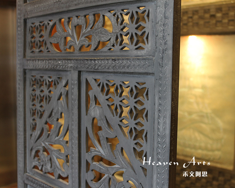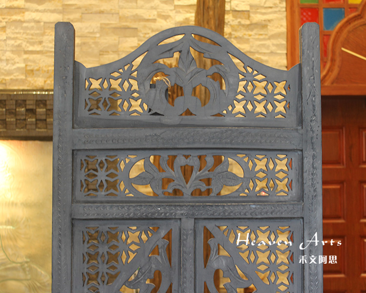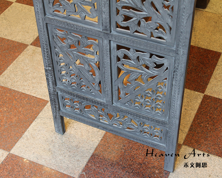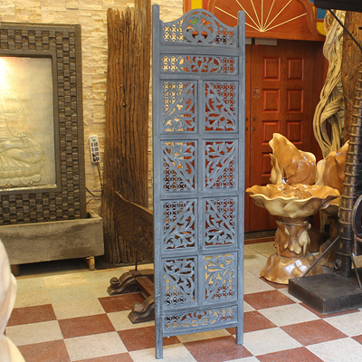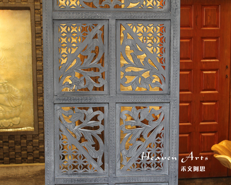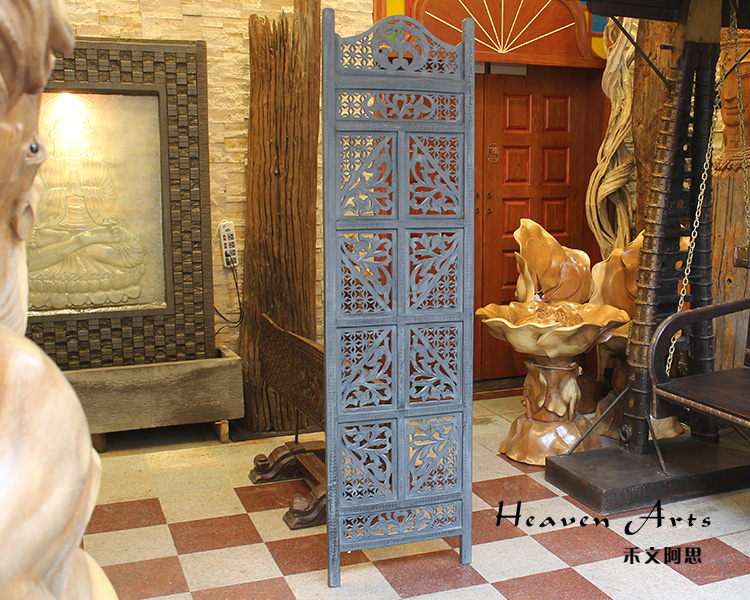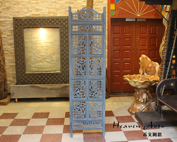 半米宽的单片精雕芒果木屏风,以艺术描绘花卉之叶,凸显出一种和谐宁静之美。双面镂空雕刻的花屏风,彰显着能工巧匠的非凡技艺,同时也赋予了屏风多角度观赏的精致美感。屏风顶上花边造型的宝顶样式,描绘出浪漫的南亚之风。花顶之下方的构图自然清新,方棱之间的十字网格与缱倦叶卉,将自然元素演绎的异常清美。手工雕刻的花卉,搭配镂空精致的雕琢,使稀稀疏疏的光线得以穿透,为芒果屏风蒙上清雅美好的氛围,而多扇屏风搭配使用的效果更甚。