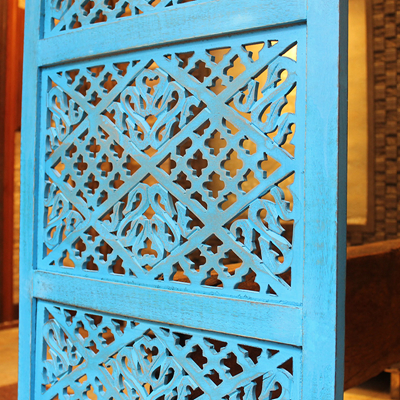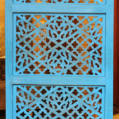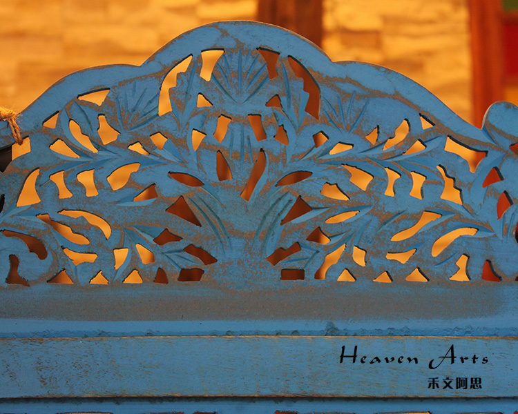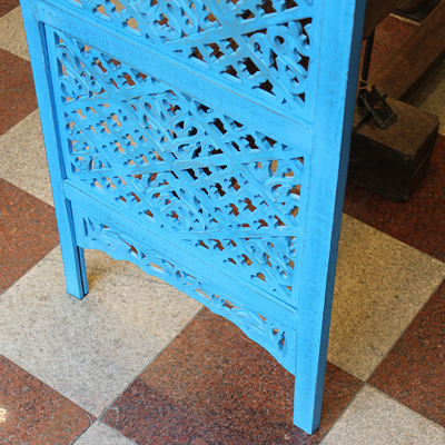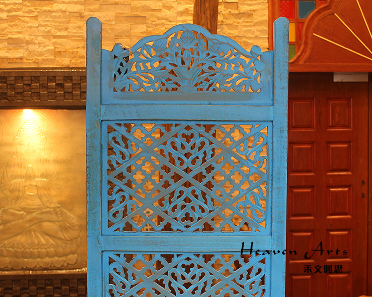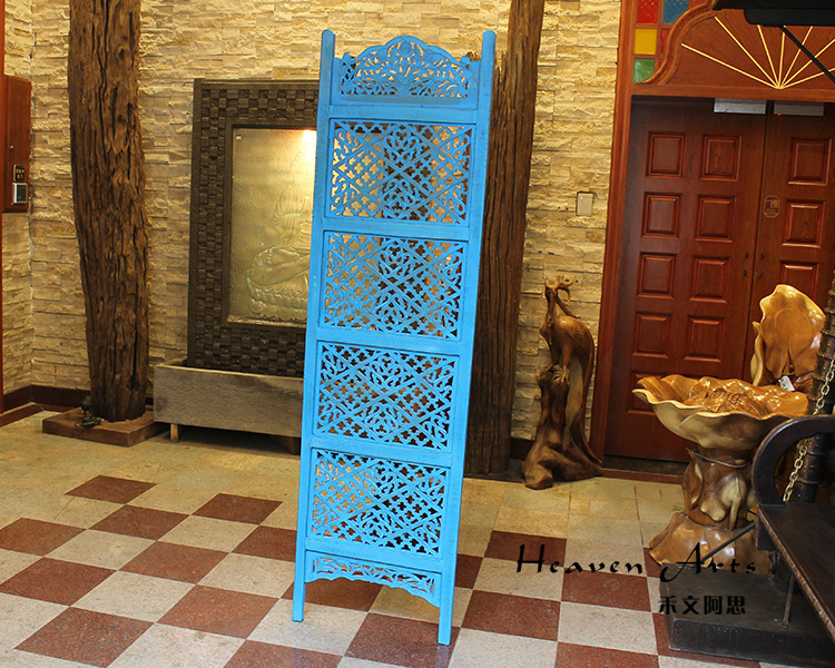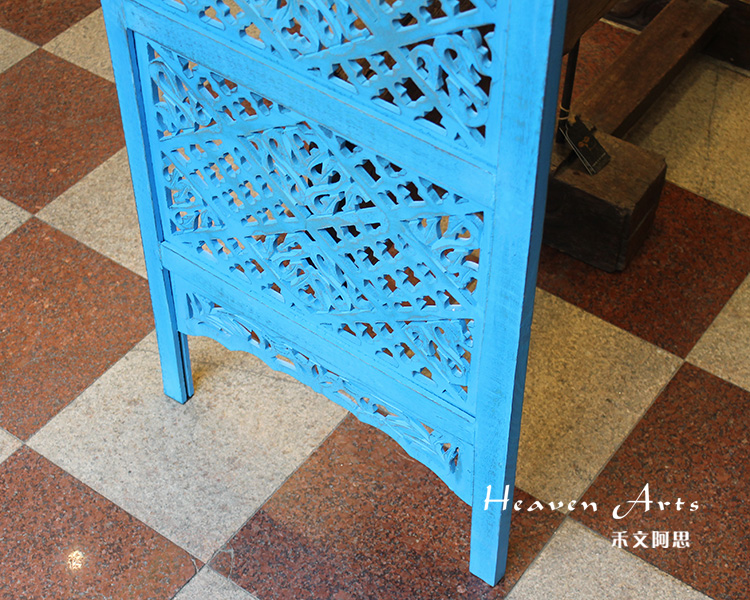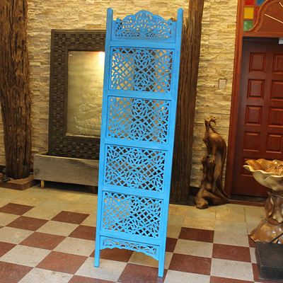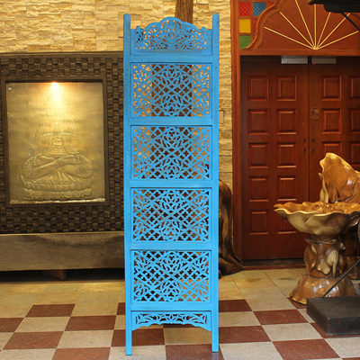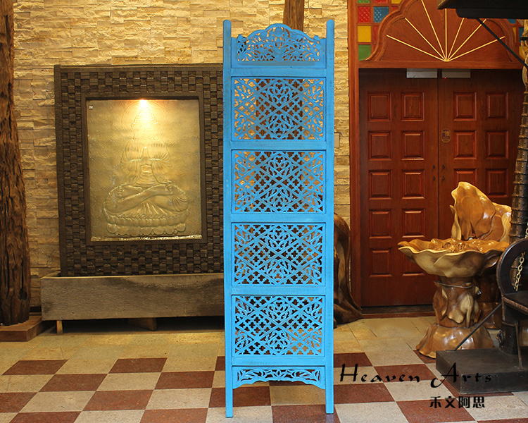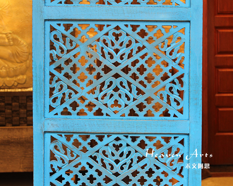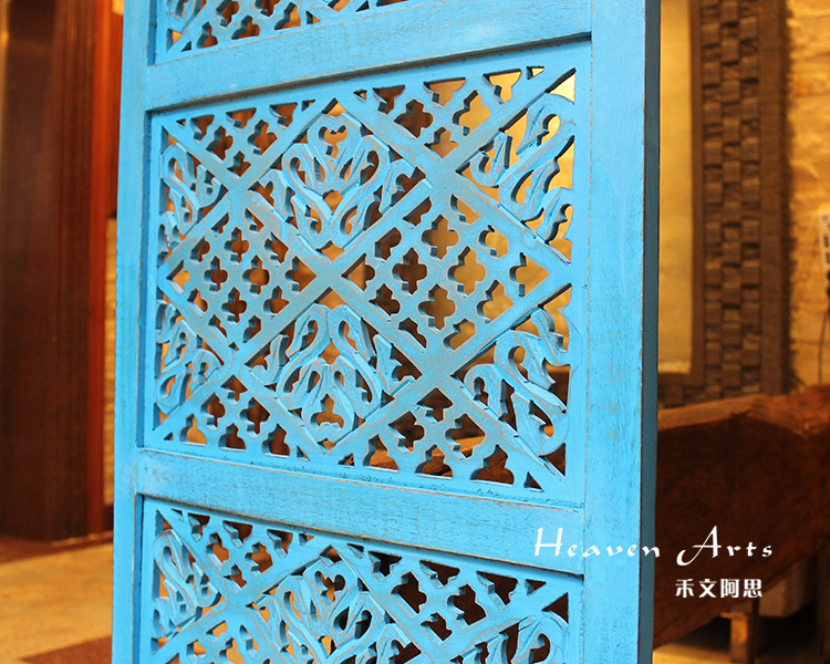 半米宽的单片精雕芒果木屏风,藤蔓雕花与几何格子交织其中,呈现出一种和谐宁静之美。双面镂空雕刻的花屏风,彰显着能工巧匠的非凡技艺,同时也赋予了屏风多角度观赏的精致美感。屏风顶上花边造型的宝顶样式,描绘出浪漫的南亚之风。花顶之下方正严谨的构图中,直线与曲线巧妙过渡,清雅而不失端庄大雅,将几何元素演绎的异常清美。手工雕刻的花卉,搭配镂空精致的雕琢,使稀稀疏疏的光线得以穿透,为芒果屏风蒙上清雅美好的氛围,而多扇屏风搭配使用的效果更甚。