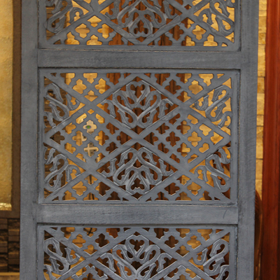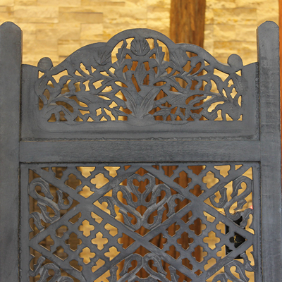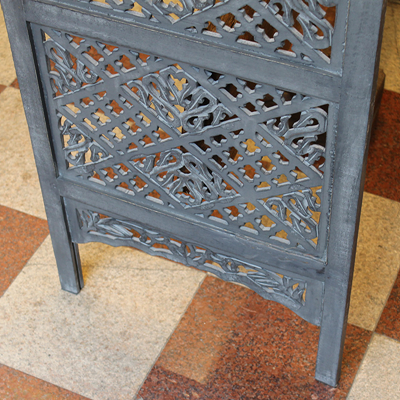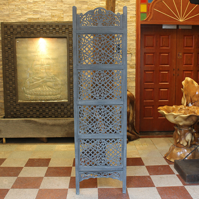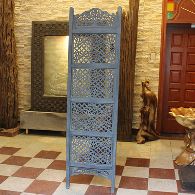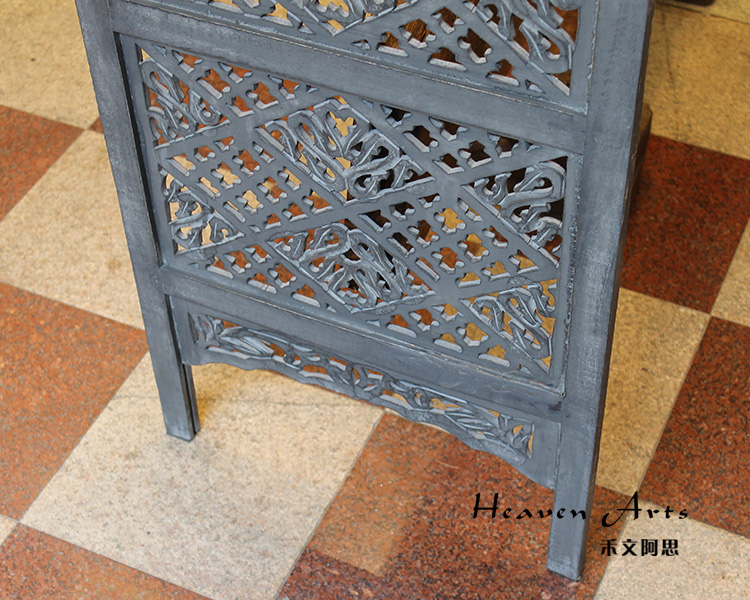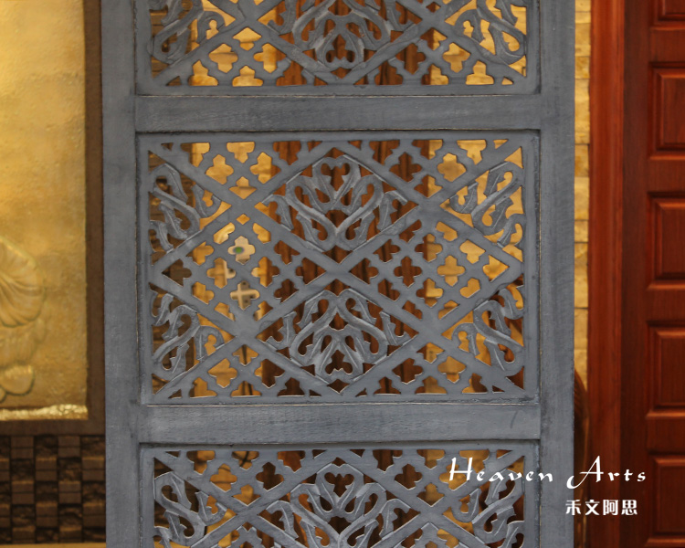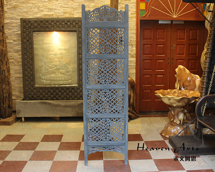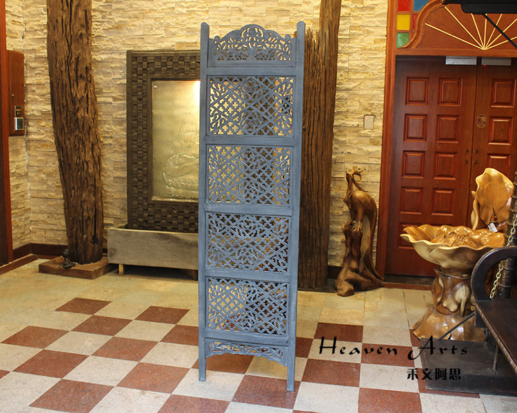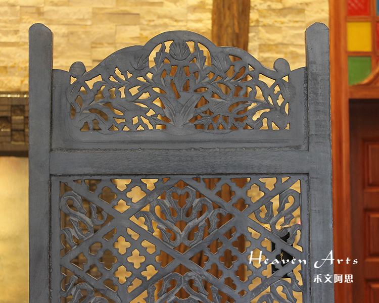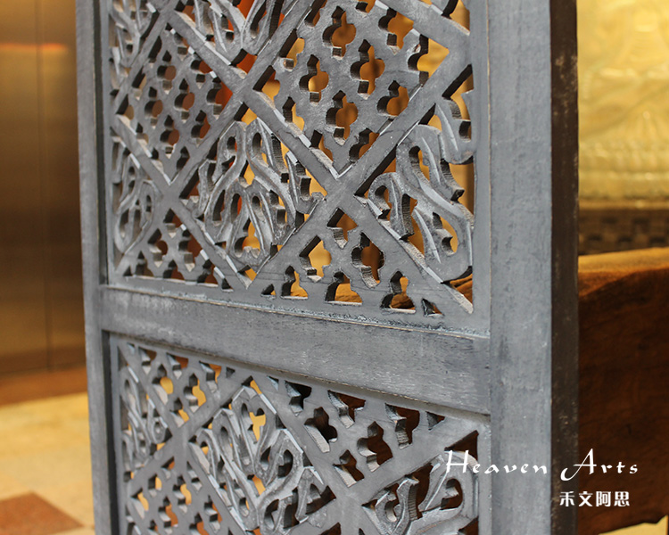 半米宽的单片精雕芒果木屏风,藤蔓雕花与几何格子交织其中,呈现出一种和谐宁静之美。双面镂空雕刻的花屏风,彰显着能工巧匠的非凡技艺,同时也赋予了屏风多角度观赏的精致美感。屏风顶上花边造型的宝顶样式,描绘出浪漫的南亚之风。花顶之下方正严谨的构图中,直线与曲线巧妙过渡,清雅而不失端庄大雅,将几何元素演绎的异常清美。手工雕刻的花卉,搭配镂空精致的雕琢,使稀稀疏疏的光线得以穿透,为芒果屏风蒙上清雅美好的氛围,而多扇屏风搭配使用的效果更甚。