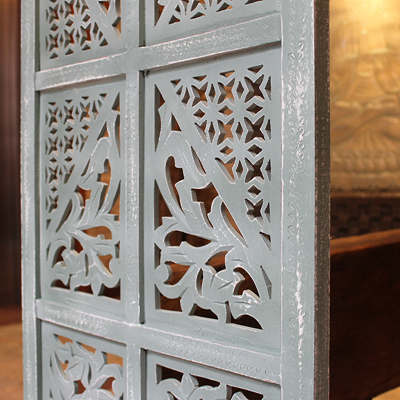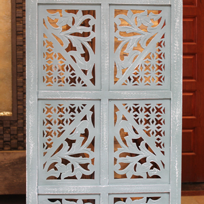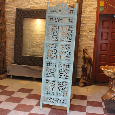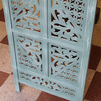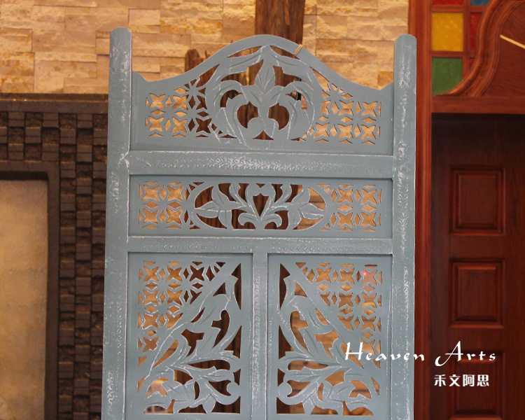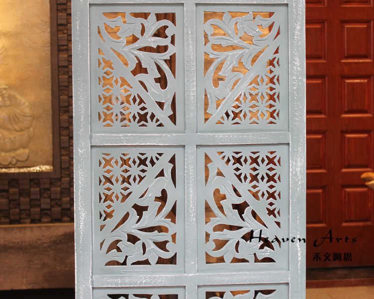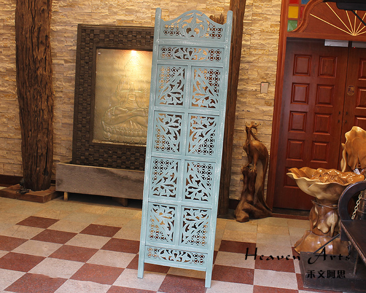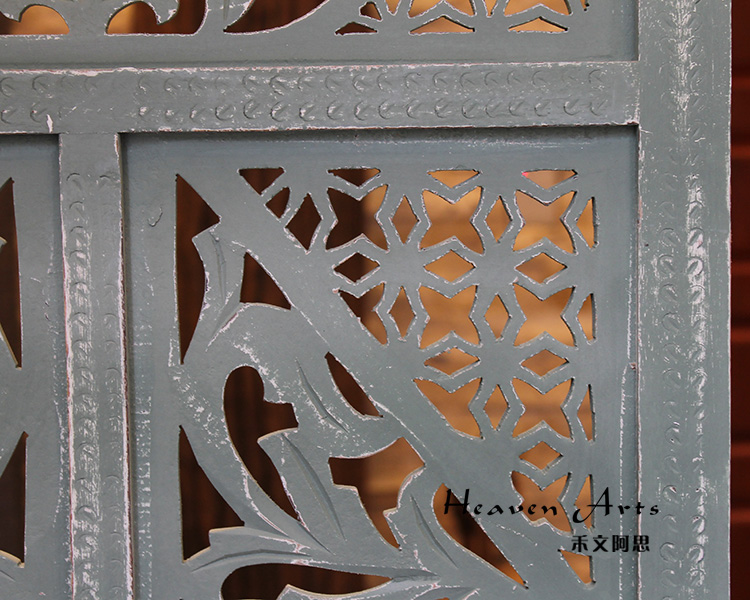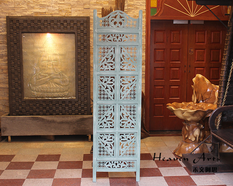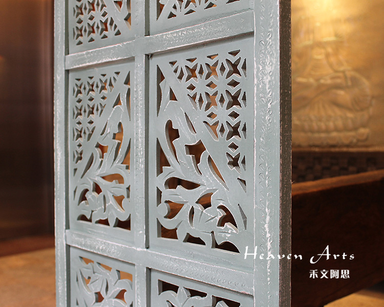 半米宽的单片精雕芒果木屏风,清新之花绽放其中,呈现出一种和谐宁静之美。双面镂空雕刻的花屏风,彰显着能工巧匠的非凡技艺,同时也赋予了屏风多角度观赏的精致美感。屏风顶上花边造型的宝顶样式,描绘出浪漫雅致的南亚之风。花顶之下的雕花形成三个别致的圆,圆内分别绽放枝繁叶茂的花,花叶繁盛清新,美感十足。同时条纹与波浪纹的相互搭配,将几何元素演绎的异常清美,而边框上的三角雕花,则使屏风的细节也趋于完美。手工雕刻的花卉,搭配镂空精致的雕琢,使稀稀疏疏的光线得以穿透,为芒果屏风蒙上清雅美好的氛围。