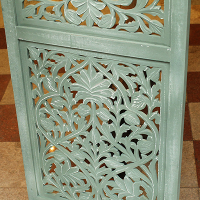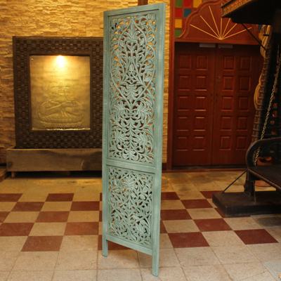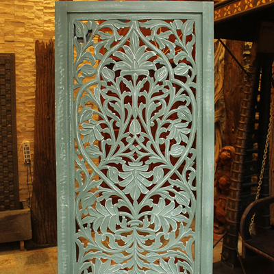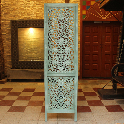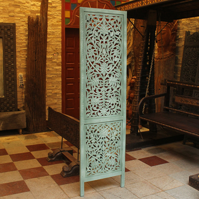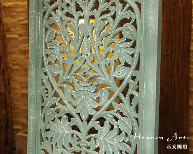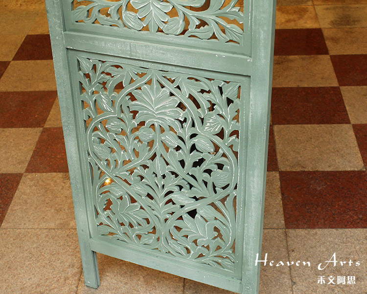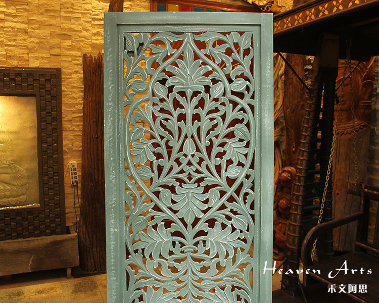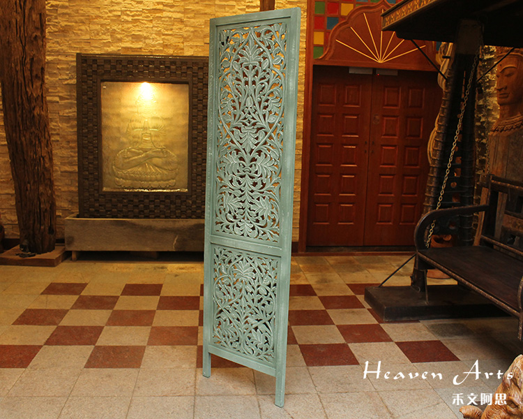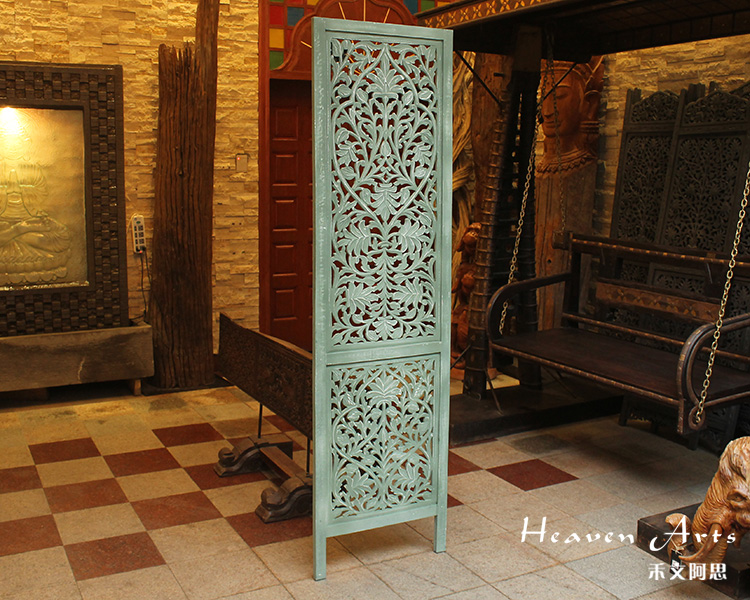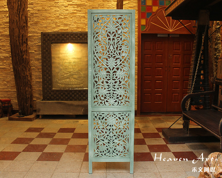 屏风是家居装饰不可分割的整体,能呈现出一种和谐之美、宁静之美,集实用性。欣赏性于一体,使极具民族传统特色的手工艺精品。半米宽的芒果木精雕单片屏风,镂空雕花极为精美雅致。以蓝墨漆着色的屏风分为上下两个部分,同样的雕花却分段呈现,别有一番雅致韵味。手工雕刻的花纹,花盛叶茂十分迷人,传统花叶盘绕洋溢着印度本土风情。清新雅致的镂空花纹,稀稀疏疏的光线穿透,蒙上宁静美好的氛围。若再搭配上一些绿色植物,则更显静谧、温馨。