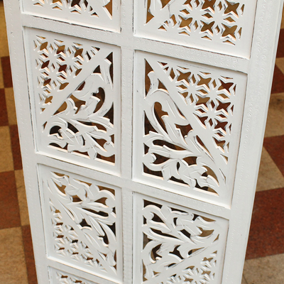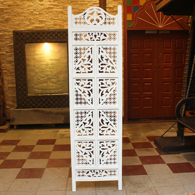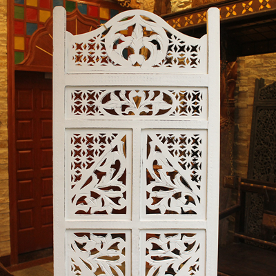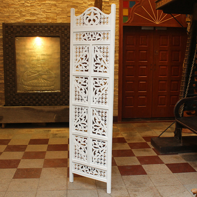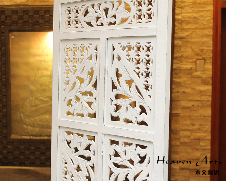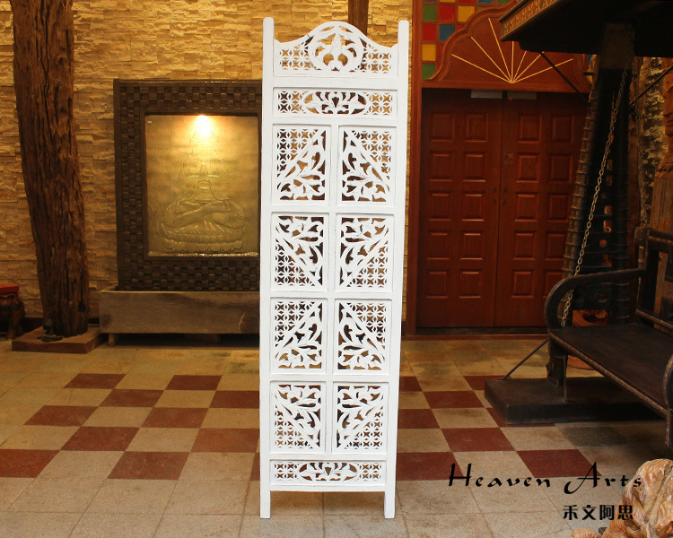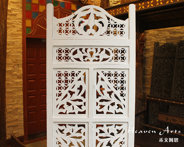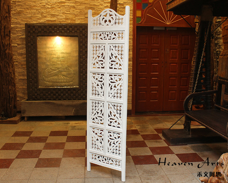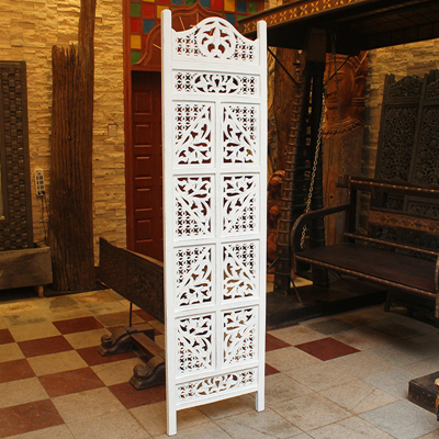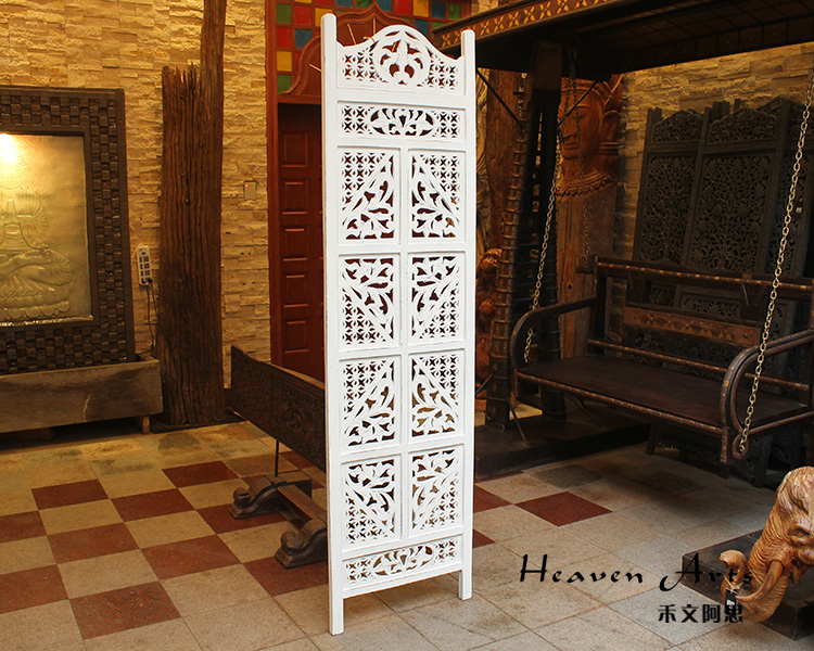 半米宽的单片精雕芒果木屏风,以艺术描绘花卉之叶,凸显出一种和谐宁静之美。双面镂空雕刻的花屏风,彰显着能工巧匠的非凡技艺,同时也赋予了屏风多角度观赏的精致美感。屏风顶上花边造型的宝顶样式,描绘出浪漫的南亚之风。花顶之下方的构图自然清新,方棱之间的十字网格与缱倦叶卉,将自然元素演绎的异常清美。手工雕刻的花卉,搭配镂空精致的雕琢,使稀稀疏疏的光线得以穿透,为芒果屏风蒙上清雅美好的氛围,而多扇屏风搭配使用的效果更甚。