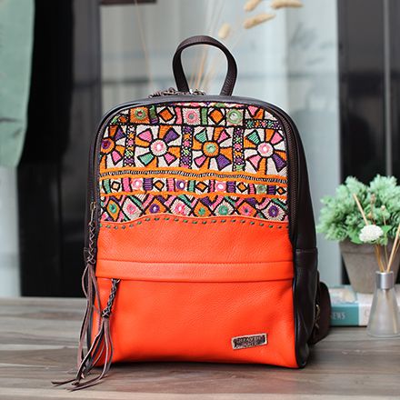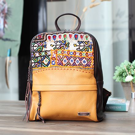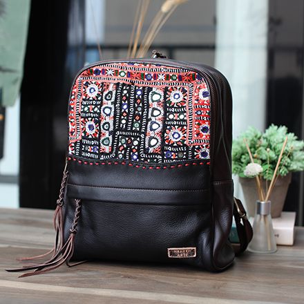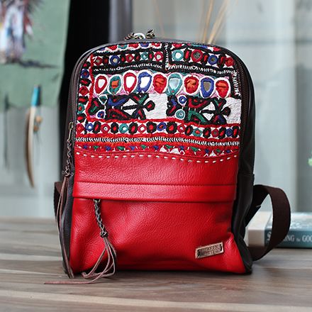 手工绣花真皮双肩包