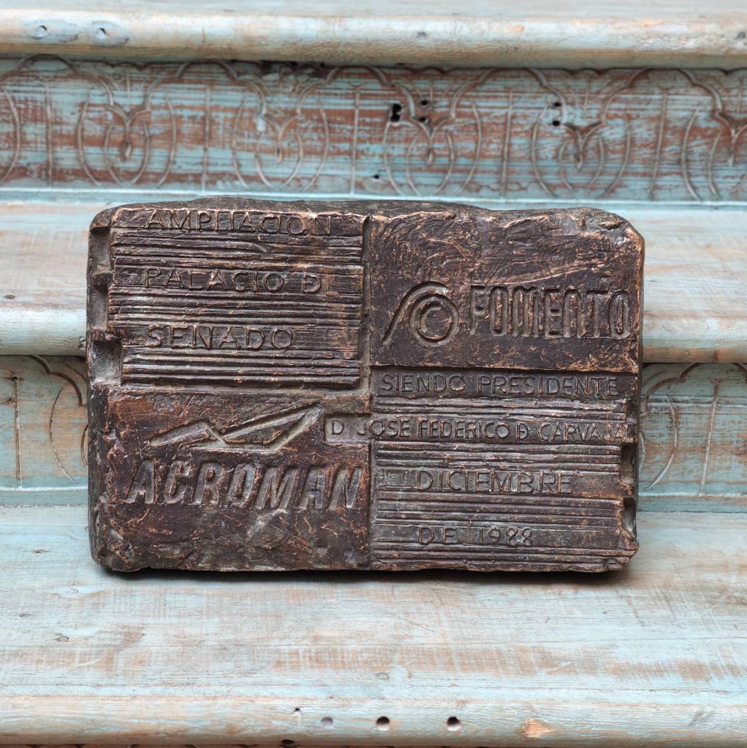 这是一块带有西班牙文的金属纪念牌或铭文牌。