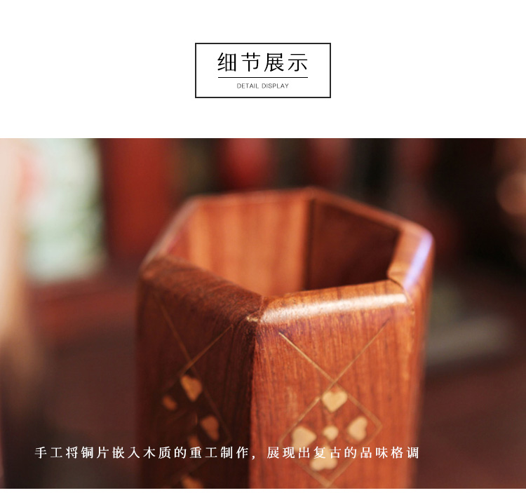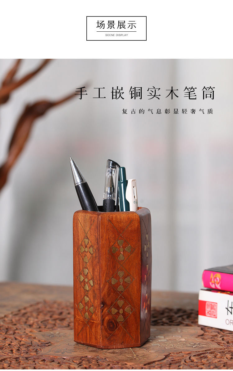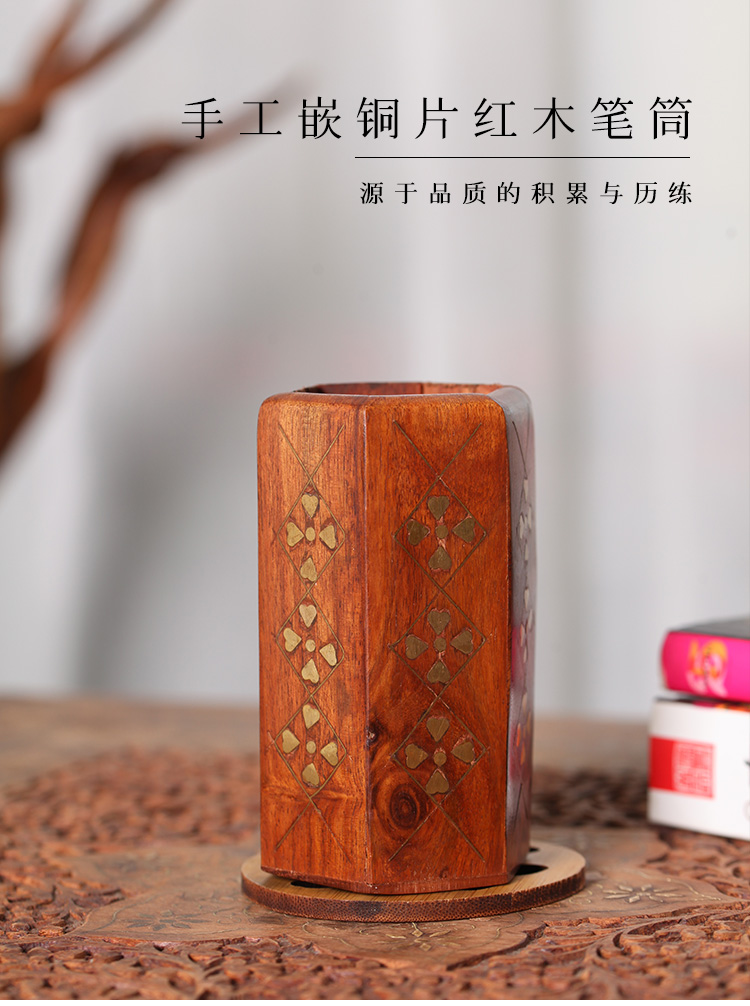 镶铜片创意天然红木笔筒方形镂空木质收纳盒紫檀复古手工实木雕刻