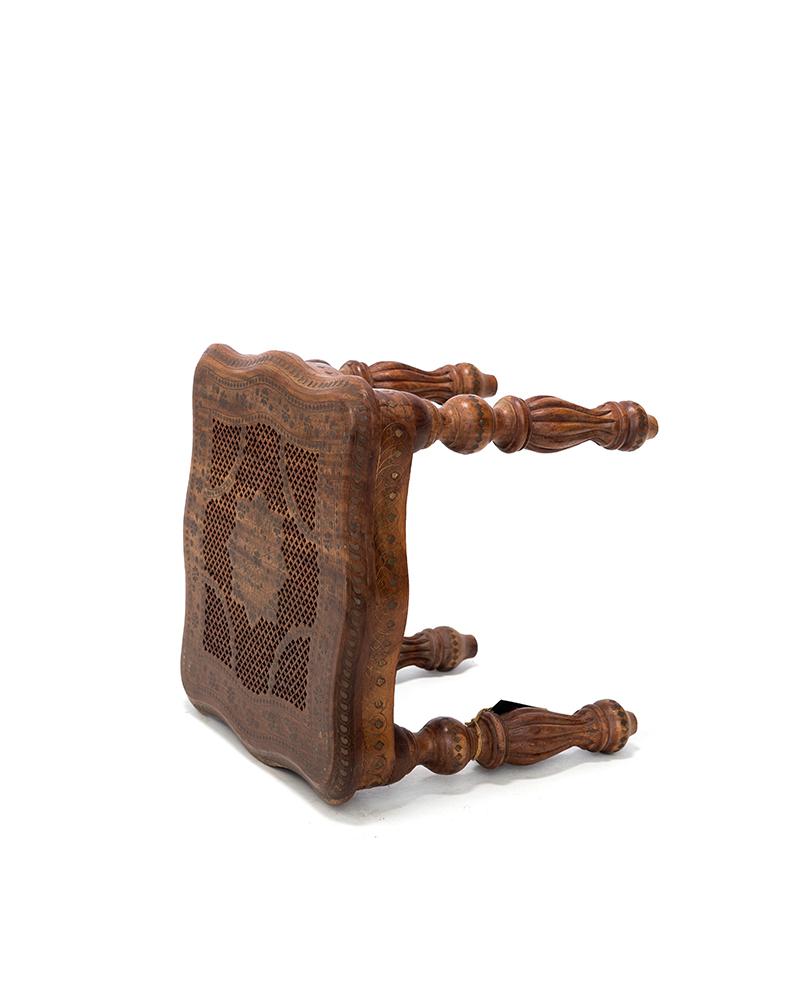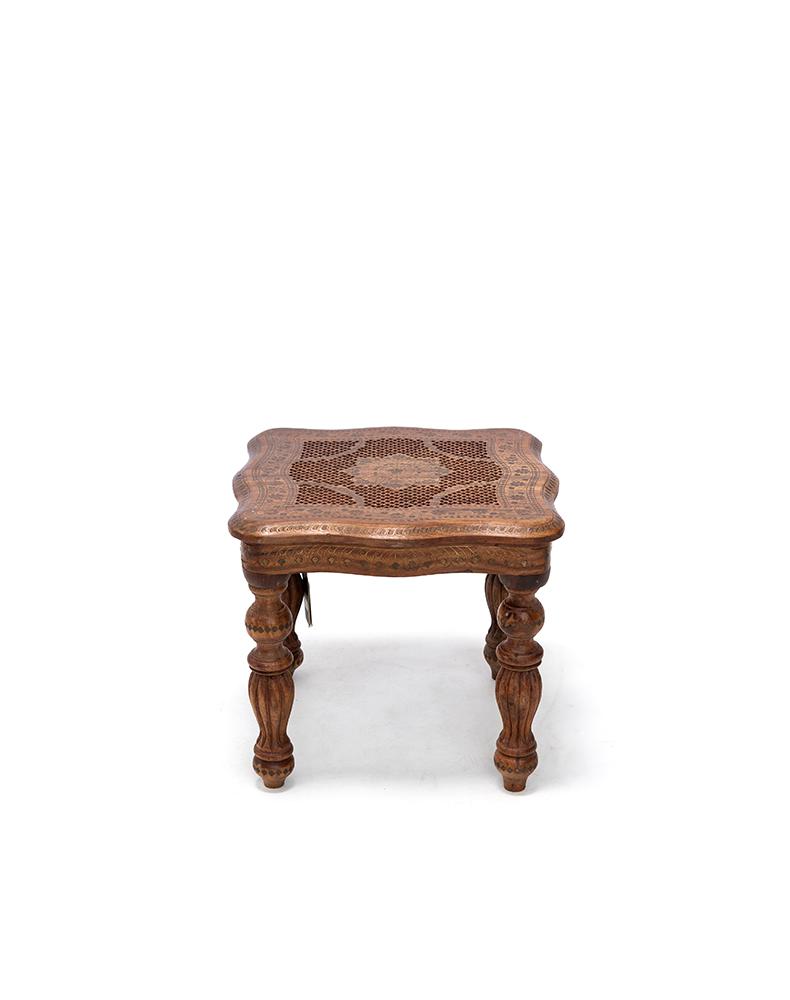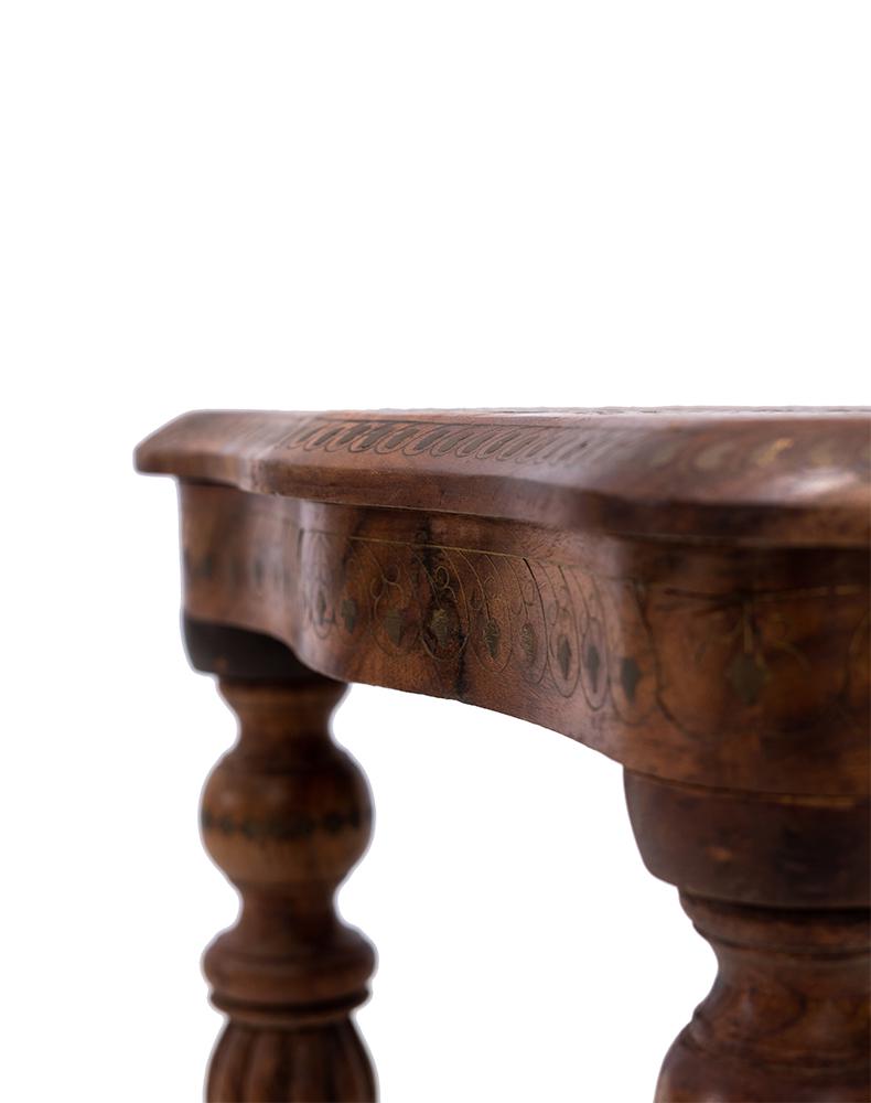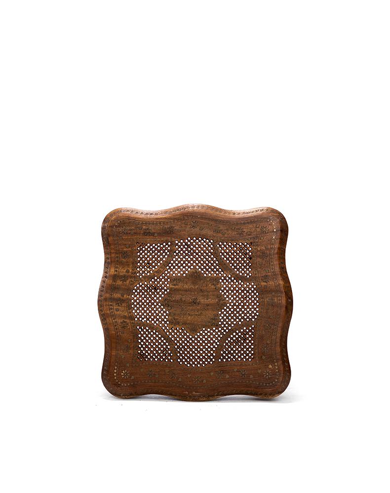 正方形的桌边是波浪型的不规则设计,较传统方方正正的感觉多了几分活力,几分韵律。用金色的铜片镶嵌出一朵高雅的花,在桌子中央寂静绽放。桌边四周同样采用铜片经行镶边,这样的设计无疑是将桌子的华丽感渲染到极致。然而桌上镂空雕刻的简约图案恰到好处的冲淡了高高在上的距离感,增添一抹平易近人的清新感。四只圆润的桌腿,细心的雕刻打磨呈现出宫廷的意蕴,使整款桌子散发出高雅的贵族气质。
