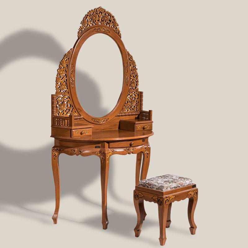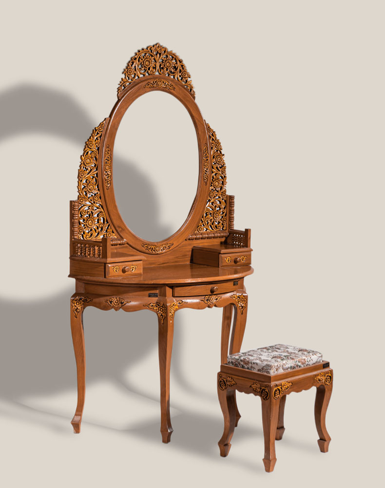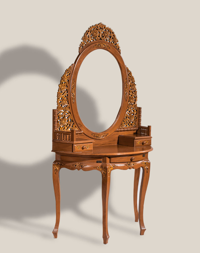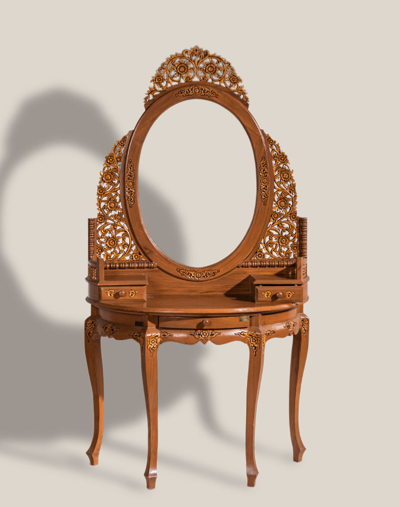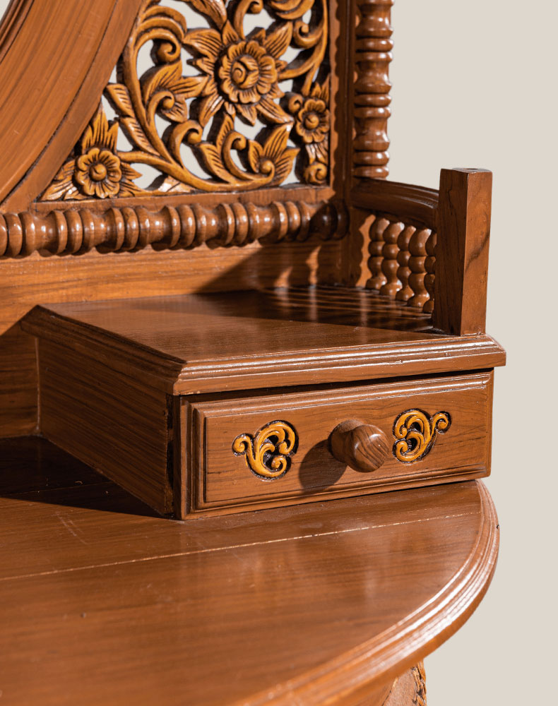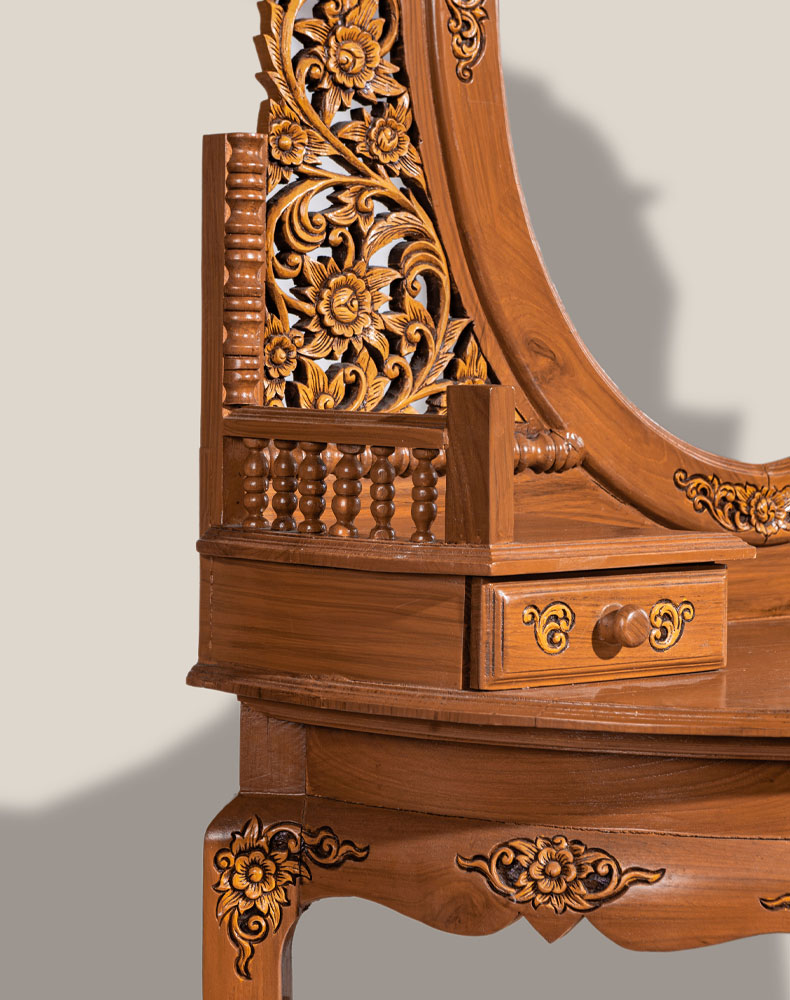 柚木质地坚硬耐磨要在上面雕刻花纹实属不易,考验的雕刻的大师的高超技艺。并且柚木拥有特殊的木性,由它制作的家具光泽会随时间的久远越发醇厚,独具魅力。用材珍贵,制作精美,设计高雅的梳妆台,值得每一位女性的拥有。