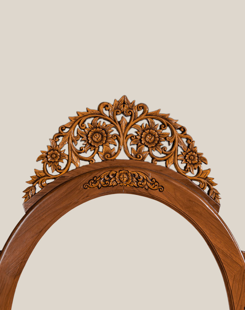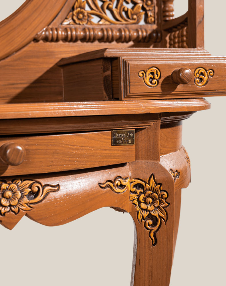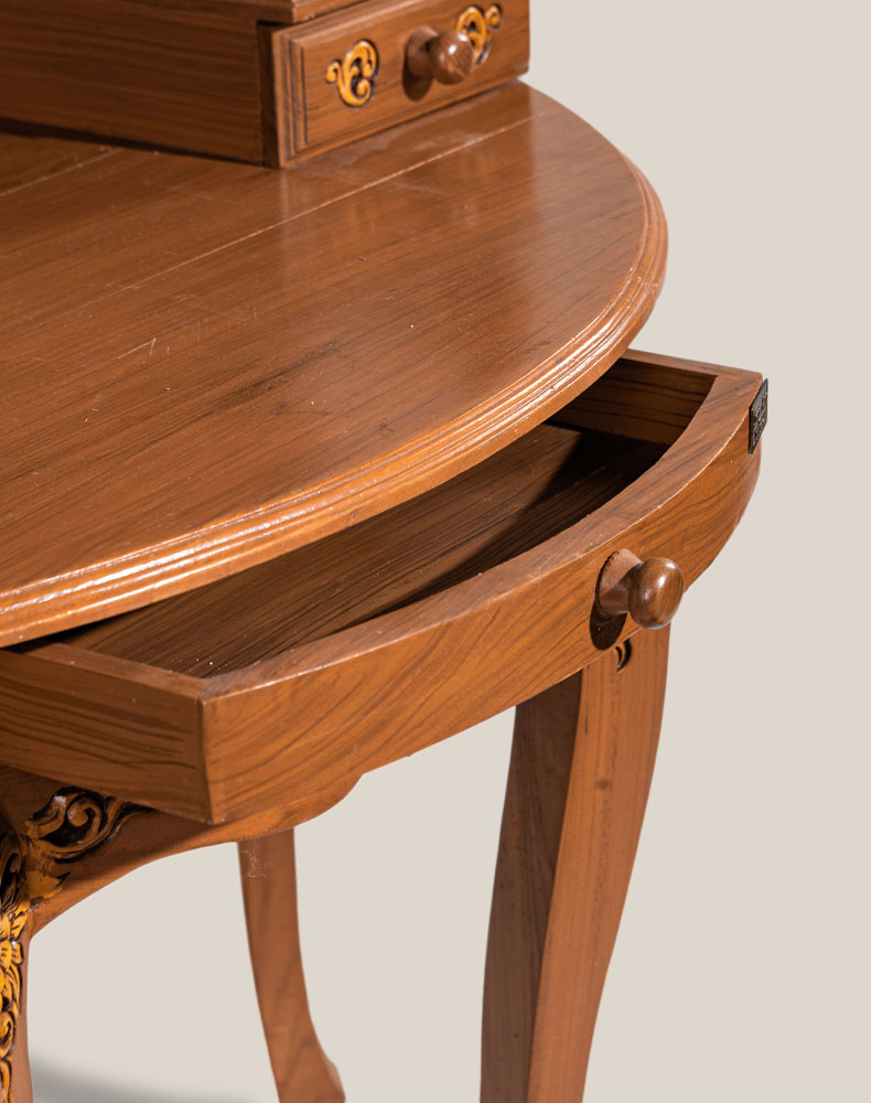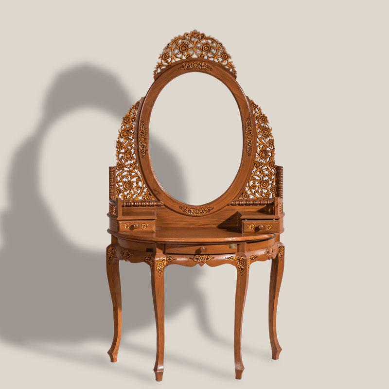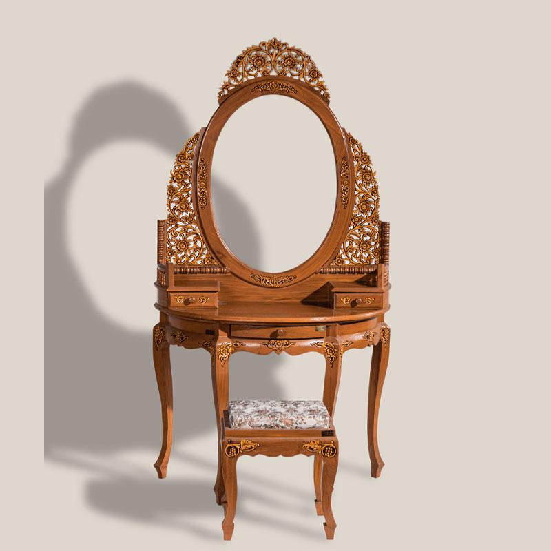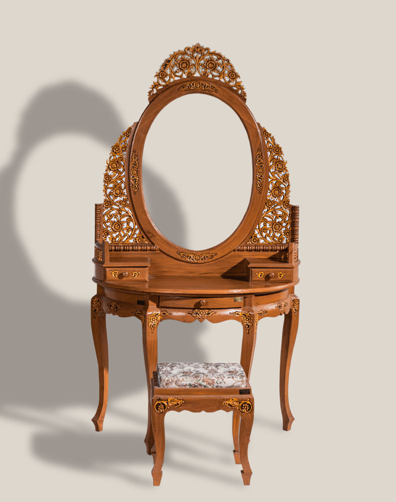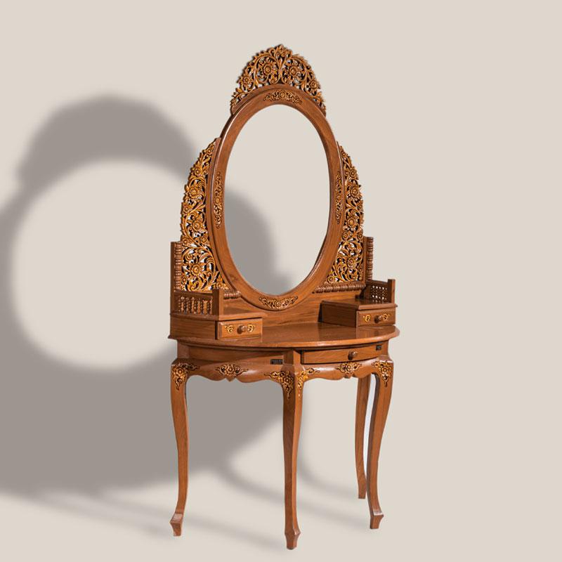 柚木质地坚硬耐磨要在上面雕刻花纹实属不易,考验的雕刻的大师的高超技艺。并且柚木拥有特殊的木性,由它制作的家具光泽会随时间的久远越发醇厚,独具魅力。用材珍贵,制作精美,设计高雅的梳妆台,值得每一位女性的拥有。