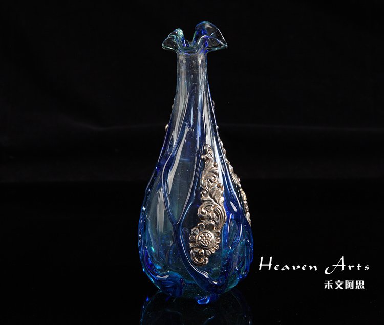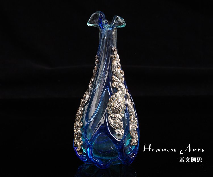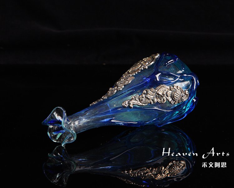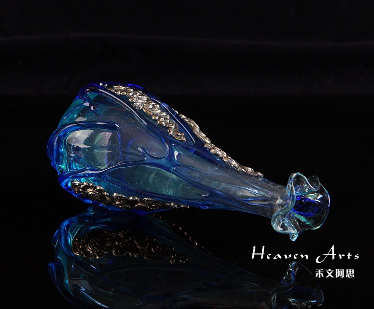 这款意大利镶银的琉璃花瓶摆件,将美与梦亲密结合,宁静浪漫的蓝色沁人心脾。其幻美的色彩,梦幻的光晕,透而冰凉的质地,透出一种意味深长的优雅意境。别致的花瓶渲染唯美的艺术气息,琉璃内,或大或小、或浮或沉的气泡,游走于晶莹剔透的水晶之中。漂浮于柔情似水的颜色带之间,是琉璃情意绵绵的低语。优美的瓶口似一朵娇赧盛开的鲜花,清新而怡人。银打造的古典花纹镶嵌在琉璃花瓶之上,独到的韵味使其越发的醉人。琉璃与银的浪漫邂逅,将古典气质与异域风情完美融合,成就别树一帜的风尚。